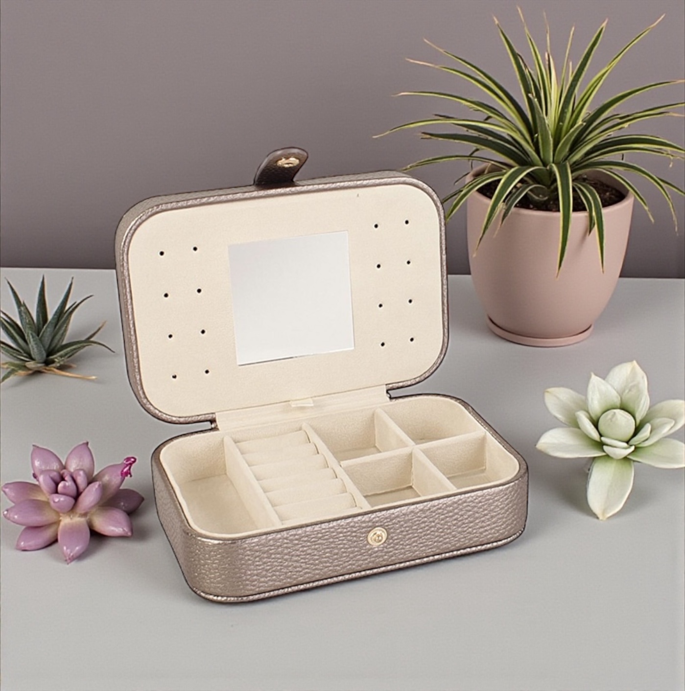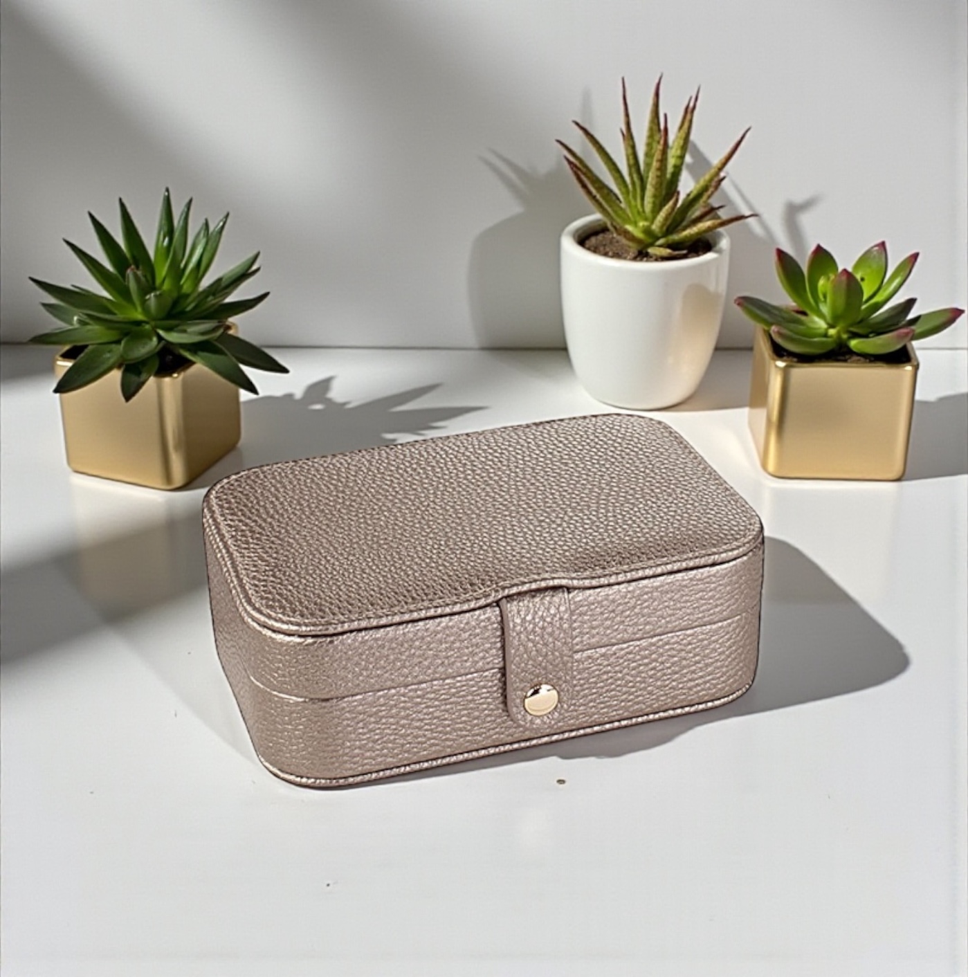 La fermeture à pression située à l’avant assure un maintien sécurisé, tandis que le format rectangle permet de glisser facilement ce coffre dans un tiroir, une valise ou de le poser élégamment sur une coiffeuse.