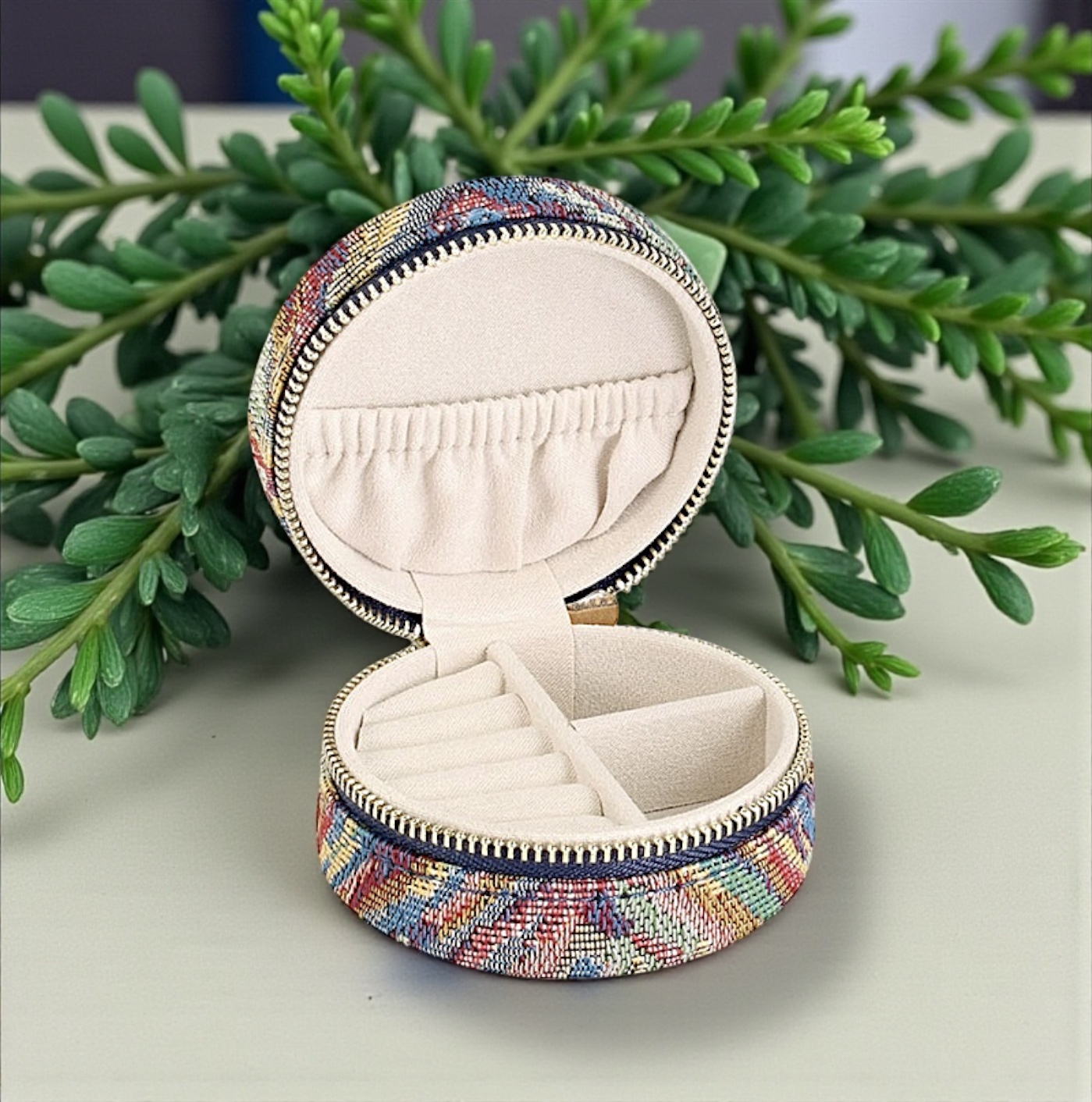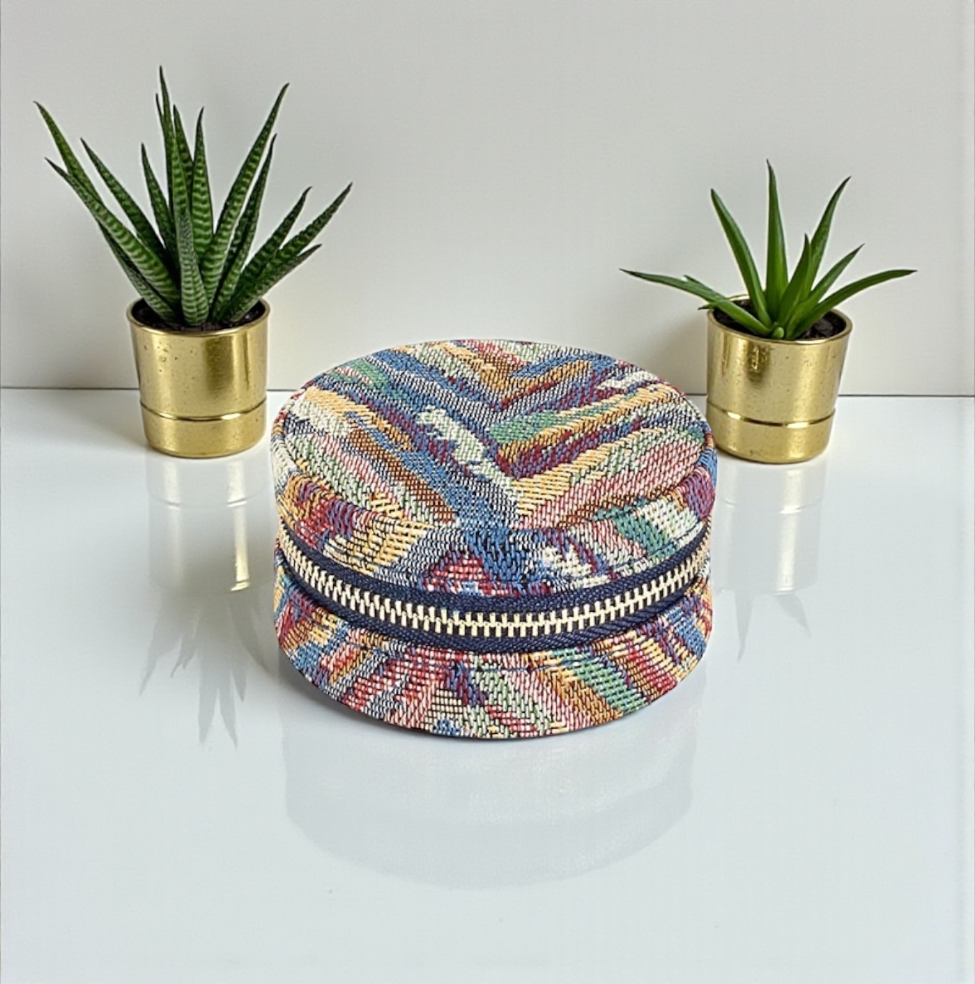 Original, élégant et plein de caractère, ce coffre à bijoux rond séduit par son revêtement en matière synthétique multicolore au motif riche et raffiné. Son design chaleureux et artistique en fait un véritable objet décoratif, aussi beau fermé que lorsqu’il s’ouvre pour révéler son intérieur délicat.