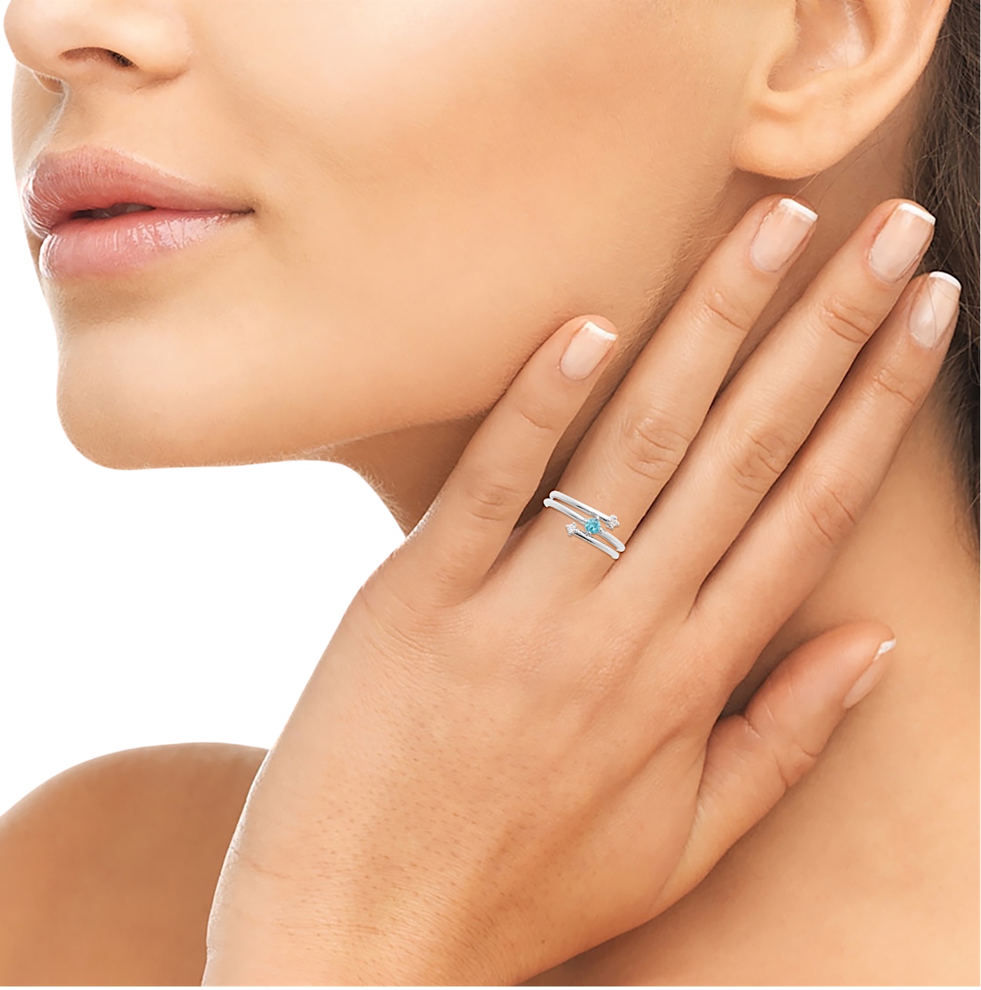 L’anneau, d’un seul tenant, se divise avec délicatesse en trois branches, formant une structure aérienne et moderne. Au centre, un oxyde de zirconium bleu turquoise capte immédiatement l’attention. Sa couleur vive évoque la fraîcheur des lagons et l’énergie douce de la mer. Deux oxydes de zirconium blancs l’accompagnent, ajoutant une touche de brillance cristalline et équilibrant parfaitement la composition.
