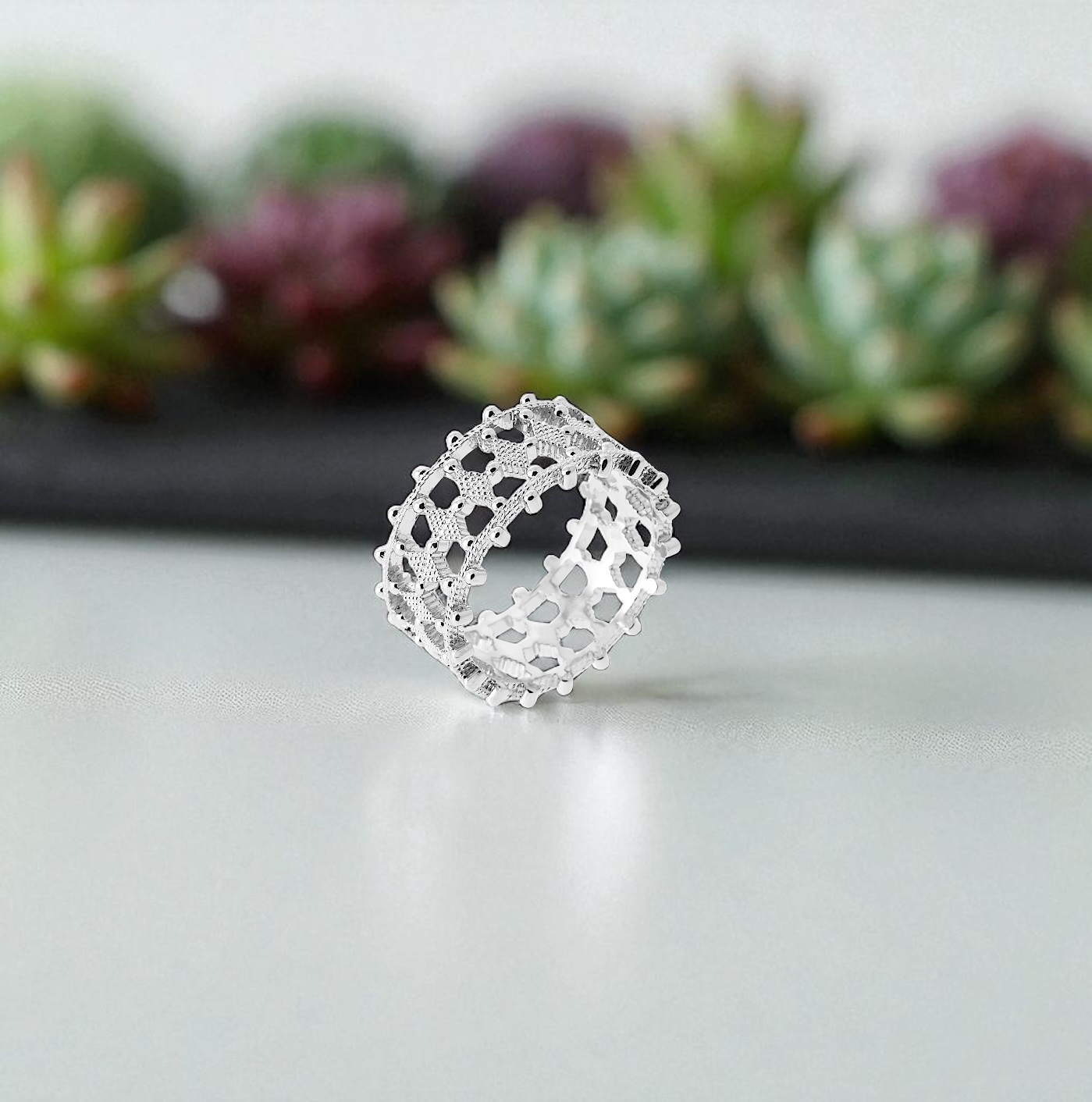 Découvrez cette bague d’exception au design ajouré, qui évoque la délicatesse d’une dentelle finement tissée en métal précieux. Sa structure légère et aérienne dévoile un motif géométrique sophistiqué, mélant harmonieusement finesse et relief pour un rendu visuel captivant.
