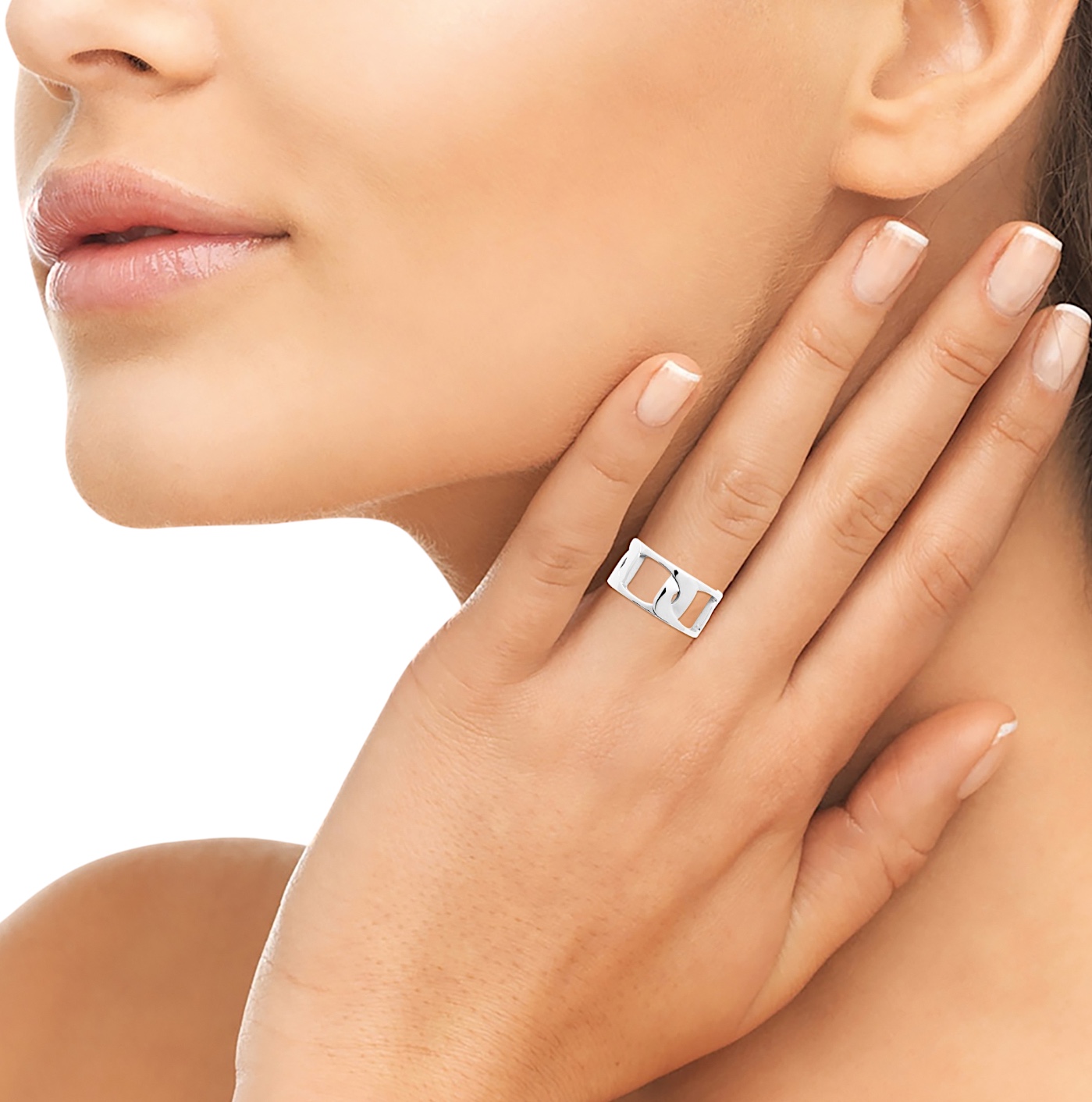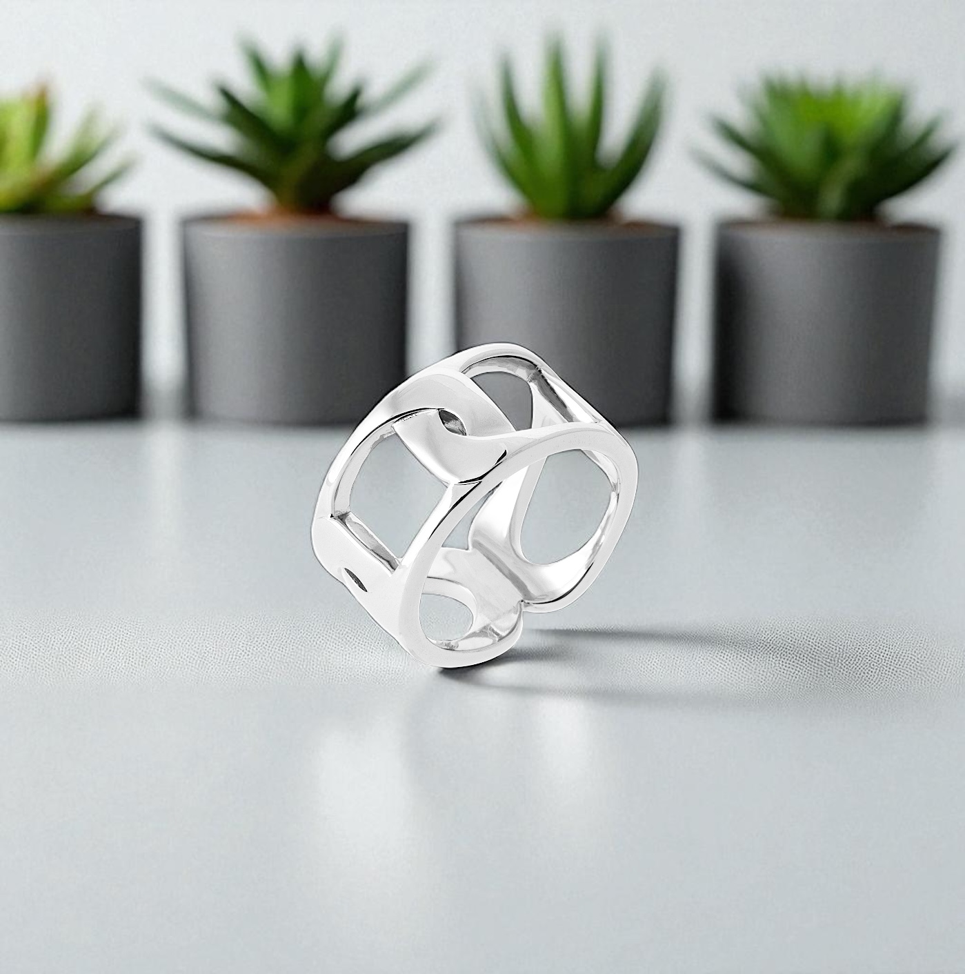 Sublimez votre style avec cette bague en argent rhodié, au design contemporain et aérien. Son architecture ouverte et géométrique met en valeur une élégante chaîne de maillons entrelacés, symbole d’un lien fort et raffiné.