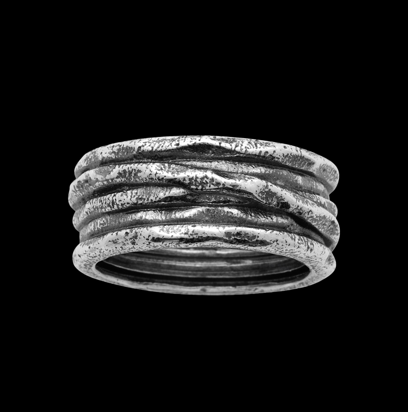 Fabriquée en argent massif 925, cette bague arbore une finition martelée et oxydée qui lui confère un aspect vieilli et artisanal, tout en conservant l’élégance intemporelle de l’argent. Les reliefs irréguliers et les strates superposées rappellent les formes naturelles de la roche ou des couches géologiques, pour un rendu résolument masculin, puissant et original.