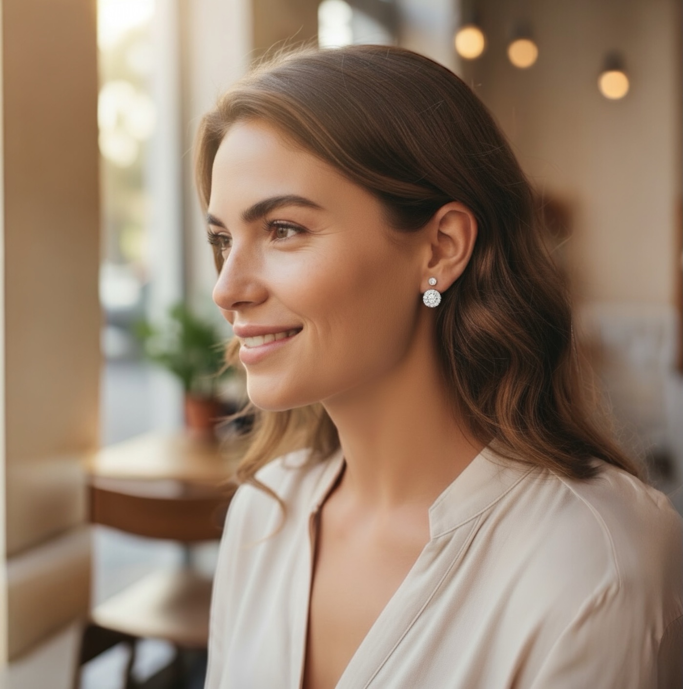 La forme arrondie de ces boucles d’oreilles confère une douceur harmonieuse, tandis que les petites pierres blanches apportent une touche de scintillement raffiné.