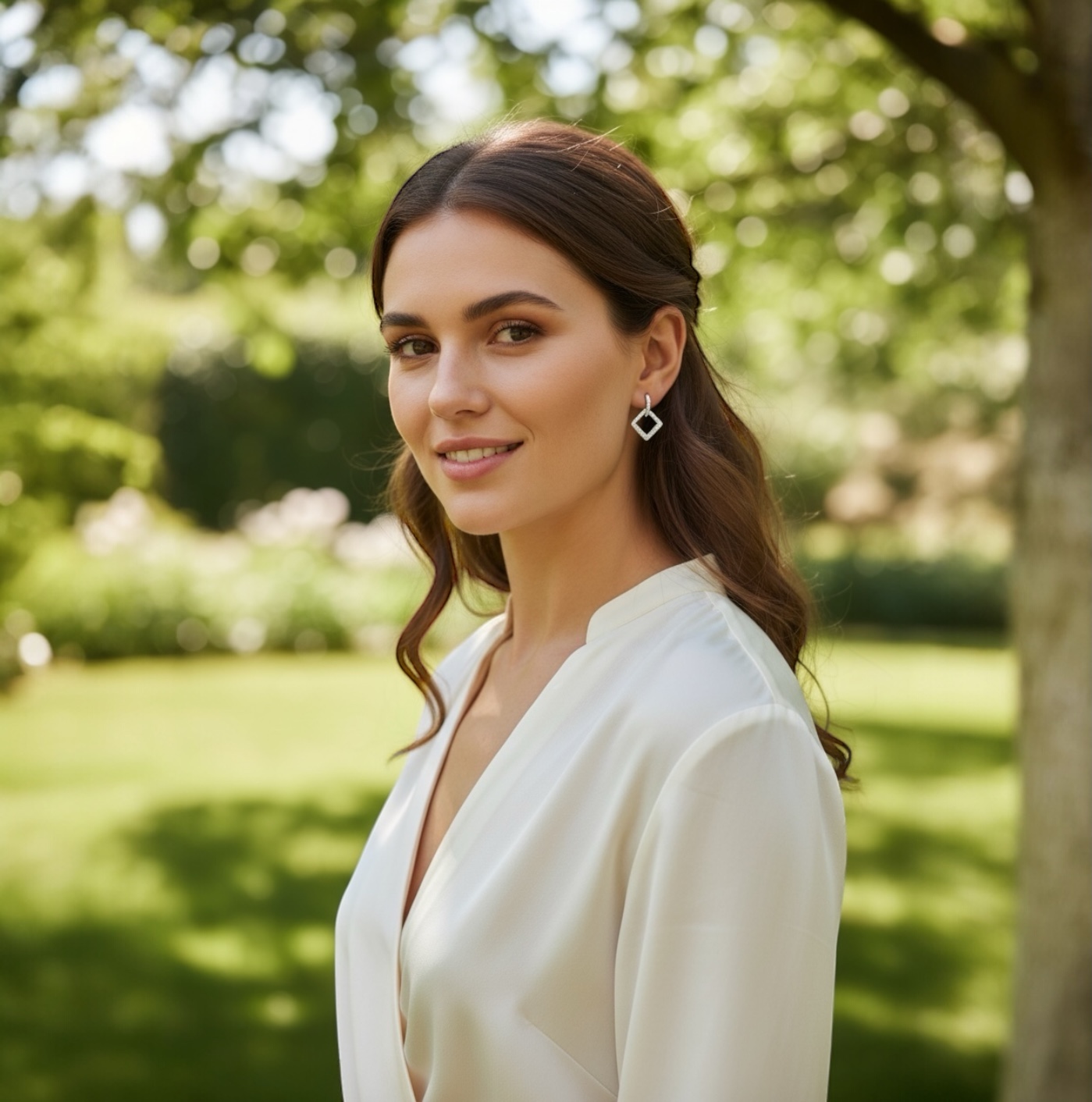 La structure principale est une créole en argent rhodié d’un diamètre de 11 mm, assurant une finition brillante, résistante à l’oxydation et hypoallergénique. Suspendue à cette base, une pampille en forme de losange vient apporter une touche contemporaine et lumineuse, grâce au pavage minutieux d’oxydes de zirconium qui captent et reflètent la lumière avec éclat.