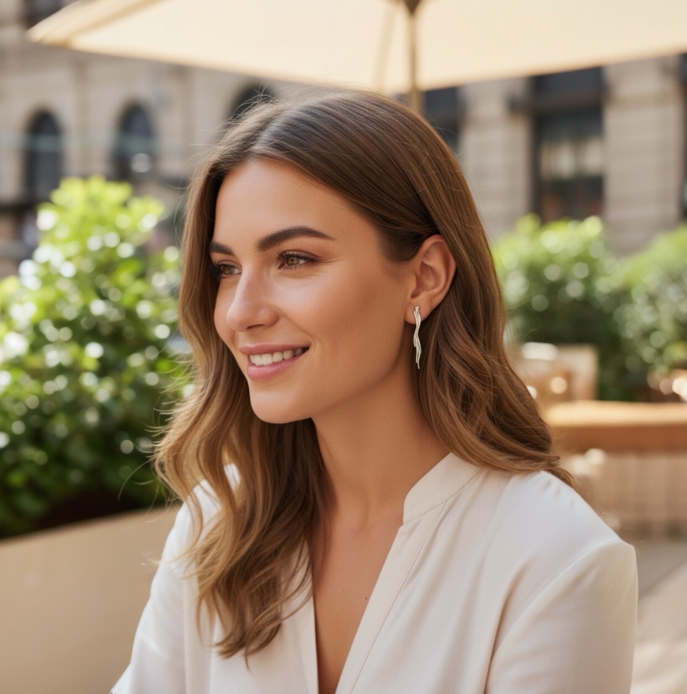 Leur forme sinueuse évoque un mouvement naturel et élégant, apportant légèreté et dynamisme à votre silhouette. La finition rhodiée leur confère un éclat lumineux et une résistance parfaite au ternissement, pour un bijou qui brille durablement.