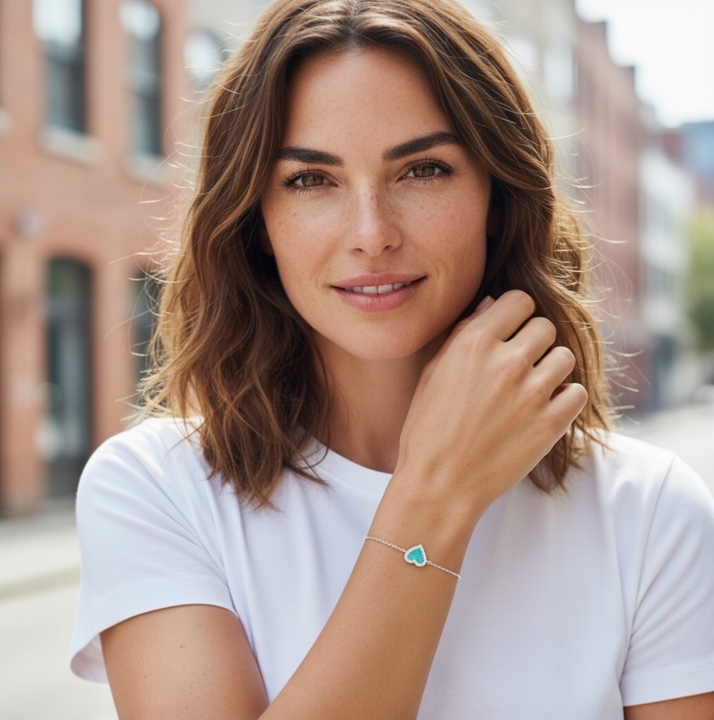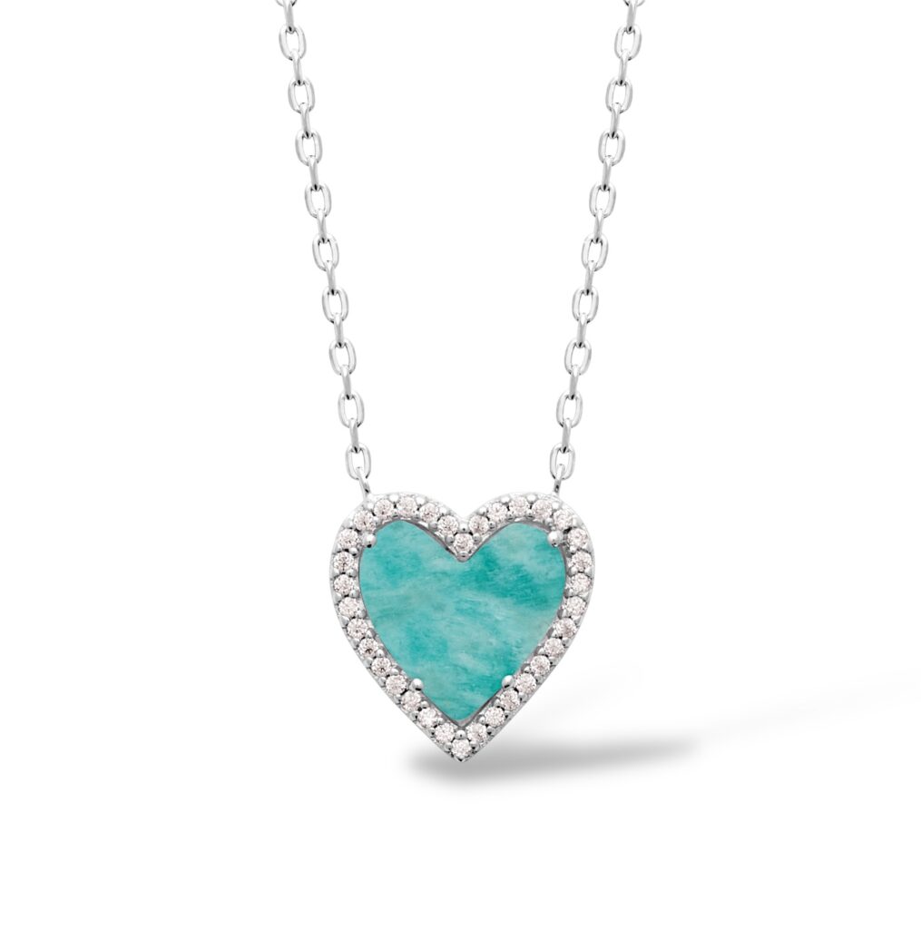 Au cœur de ce bijou délicat se trouve une pierre naturelle d’amazonite, reconnue pour sa belle couleur bleu-vert apaisante et ses vertus harmonisantes. Cette pierre en forme de cœur est sublimée par un contour pavé d’oxydes de zirconium, qui apportent une touche de scintillement raffinée et précieuse.