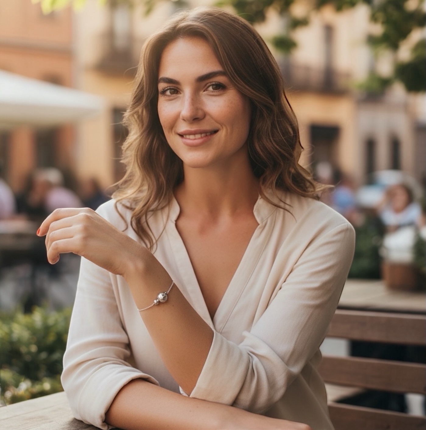 Ce bracelet en argent rhodié se distingue par son design épuré et contemporain, sublimé par deux sphères texturées de tailles différentes, placées en équilibre au centre d’une chaîne fine. L’effet martelé délicat des boules capte subtilement la lumière, ajoutant une touche de caractère tout en restant sobre.