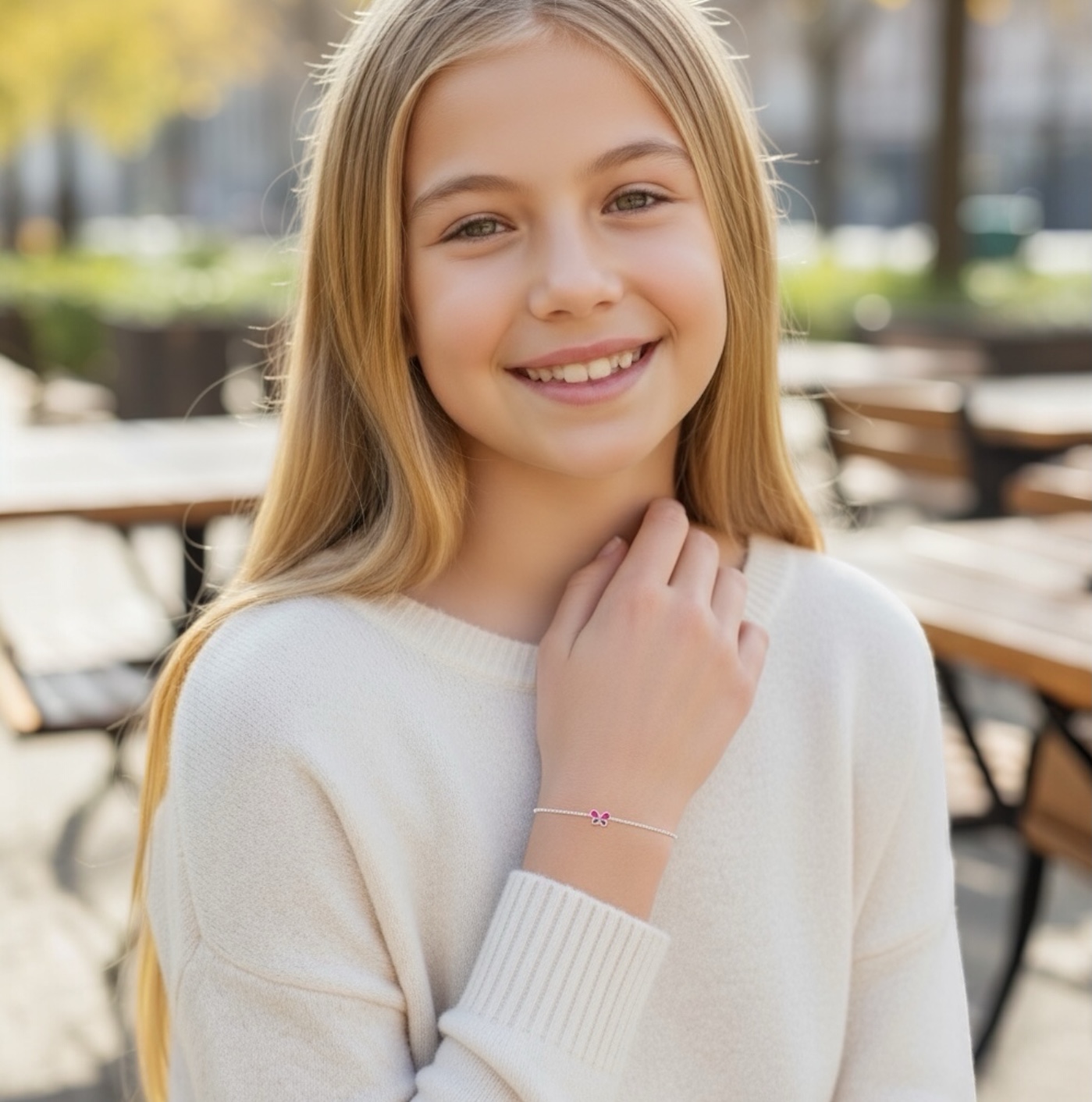 Ce ravissant bracelet pour petite fille représentant un papillon recouvert de laque rose, violet est empreint de légèreté et de douceur.