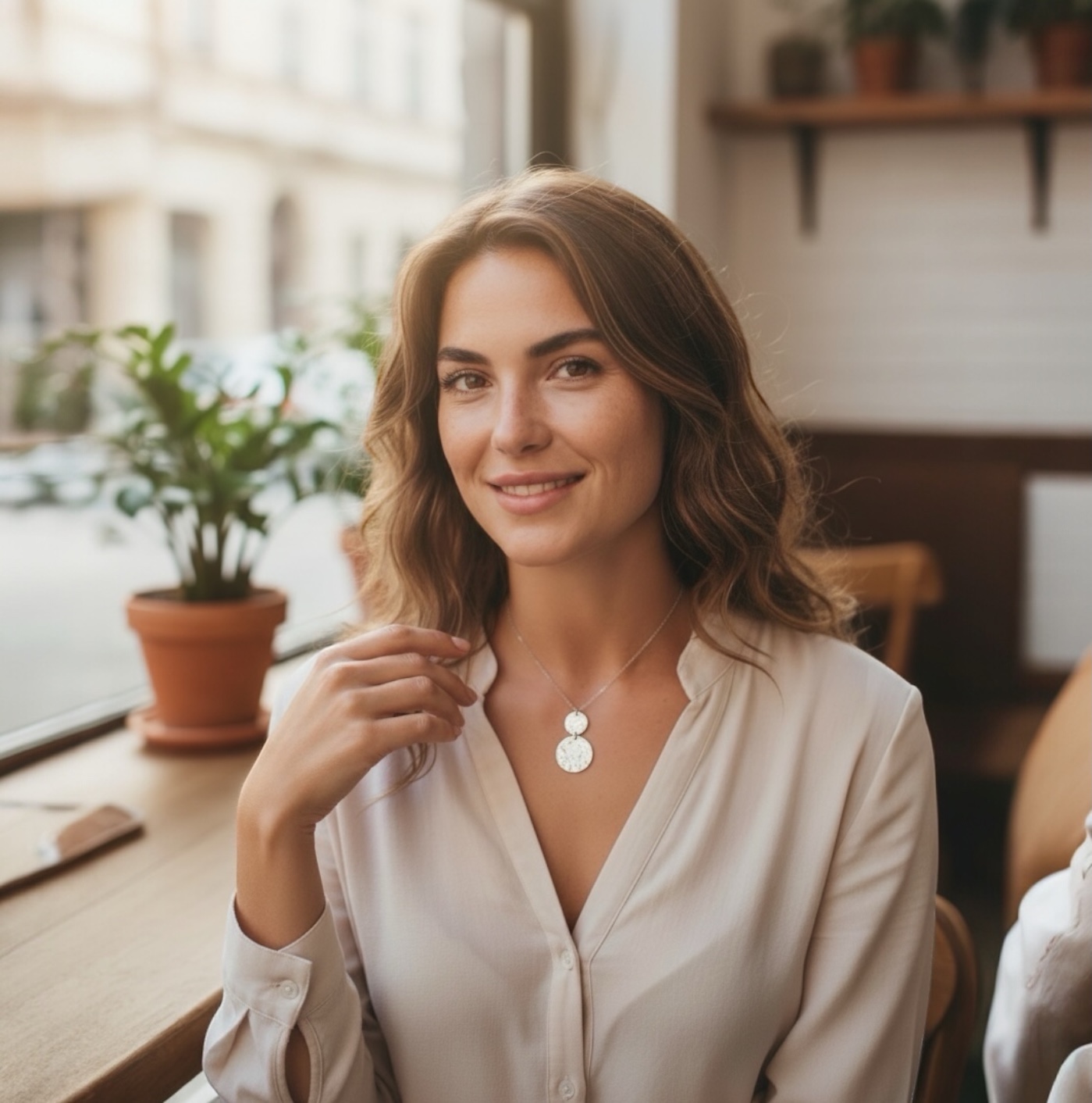 Laissez-vous séduire par ce collier moderne et sophistiqué, composé de deux disques martelés finement suspendus l’un à l’autre. Chaque disque capte la lumière avec intensité grâce à son effet texturé, créant un jeu d’éclats subtils à chaque mouvement.