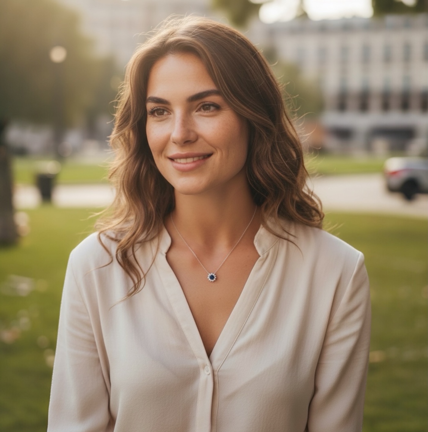 Il est orné d’un oxyde de zirconium ovale d’un bleu au centre de son pendentif, à l’aide de griffes. Les oxydes de zirconium blancs accentuent le contour et lui donnent une luminosité et un éclat accrus, tandis que l’argent massif apporte une note de grâce et de volupté à ce magnifique bijou.