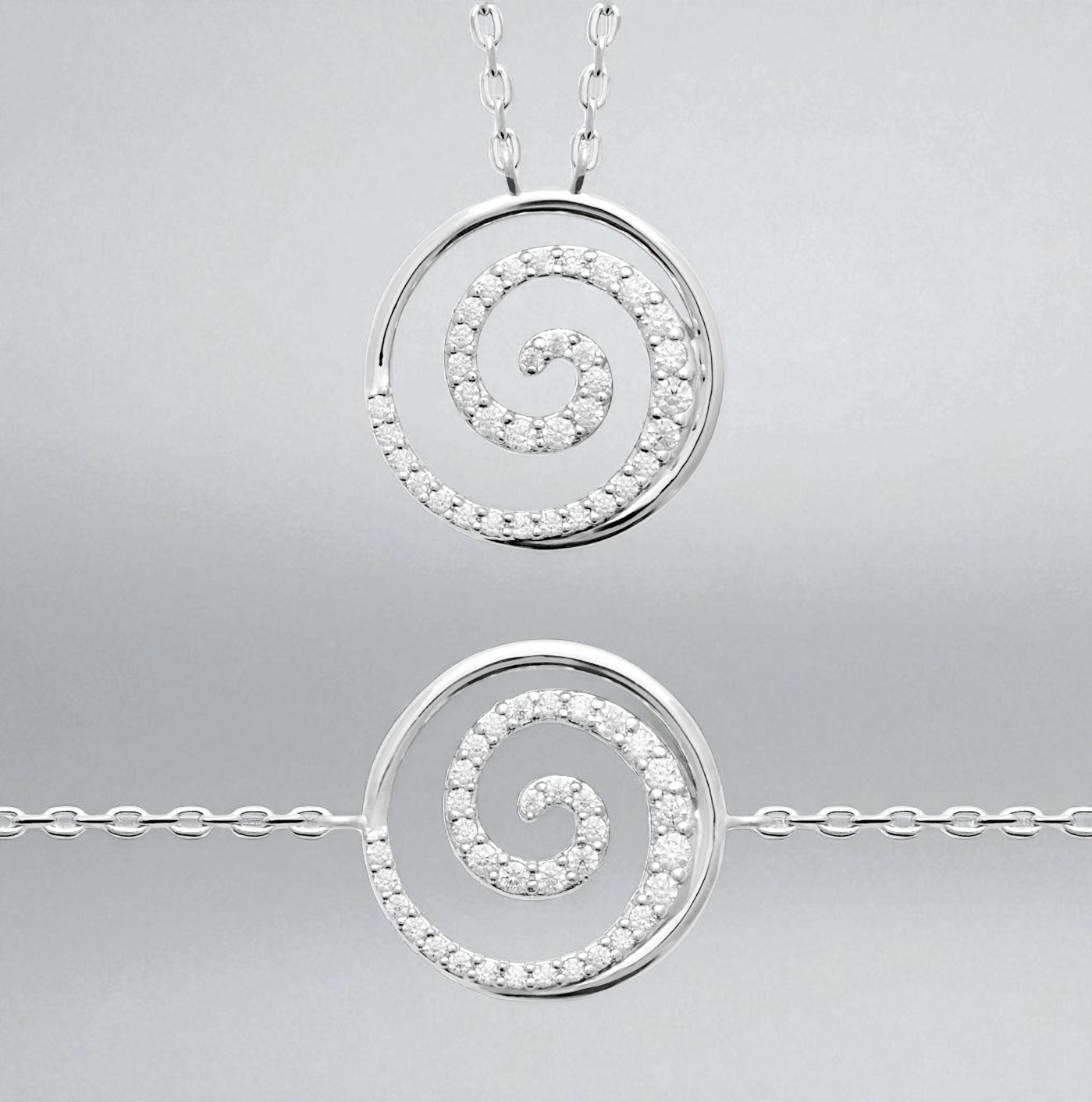 Ce collier en argent rhodié séduit par l’éclat raffiné de son pendentif spiralé serti d’oxydes de zirconium étincelants. Chaque pierre reflète la lumière avec intensité et souligne les courbes harmonieuses de ce motif intemporel, symbole d’élégance et de mouvement.
