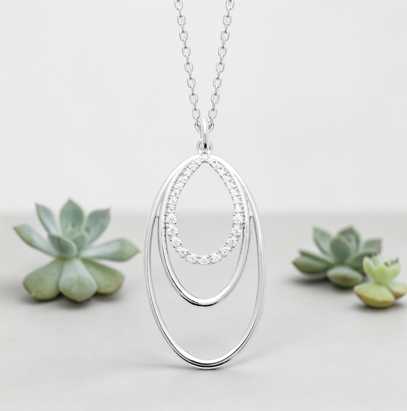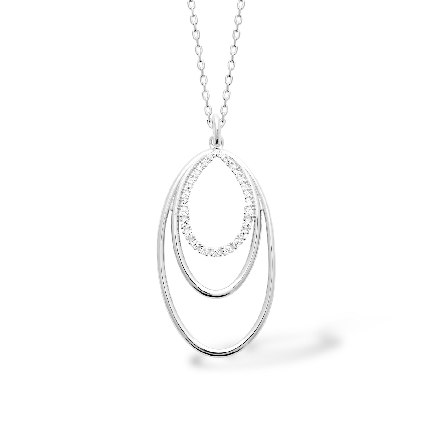 Son pendentif, composé de deux formes ovales délicatement superposées, joue sur les volumes et la légèreté. Au cœur de cette structure aérienne, un ovale finement serti d’oxydes de zirconium scintillants capte la lumière avec subtilité, créant un contraste raffiné entre la pureté du métal et l’éclat des pierres. Les lignes fluides et ouvertes apportent une sensation de mouvement et de légèreté, pour un rendu à la fois contemporain et sophistiqué.