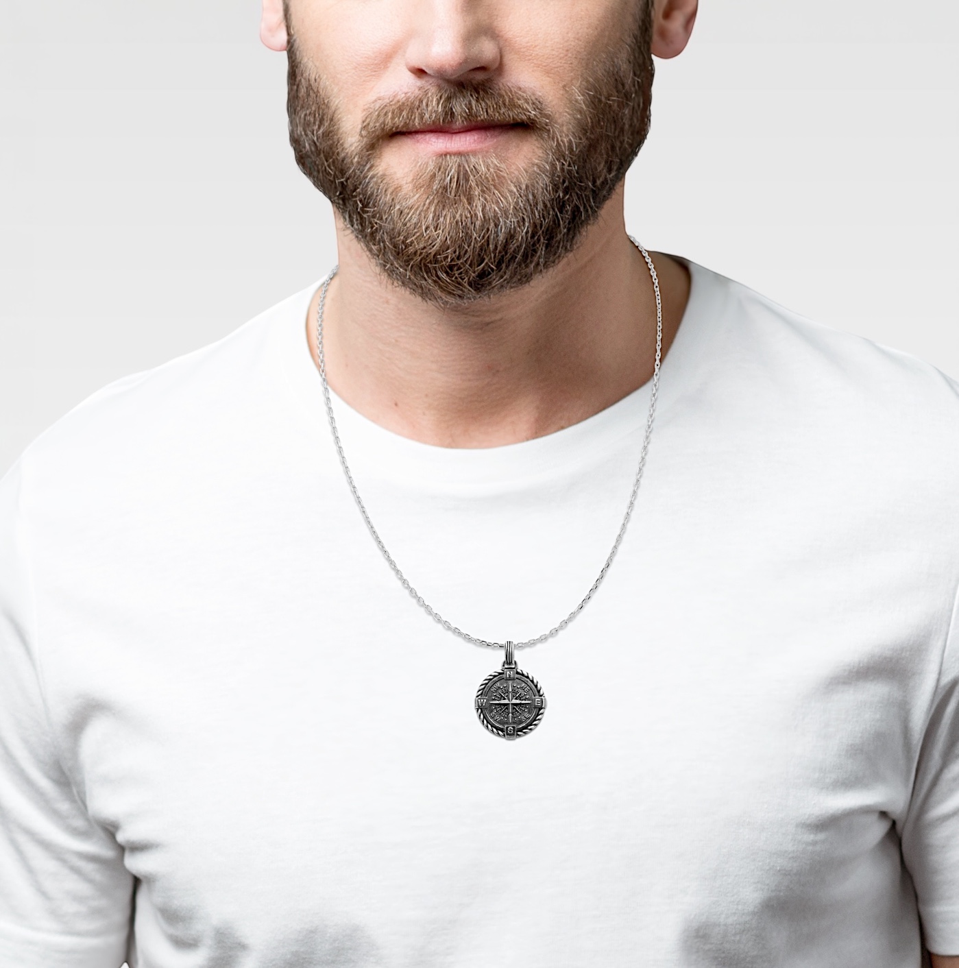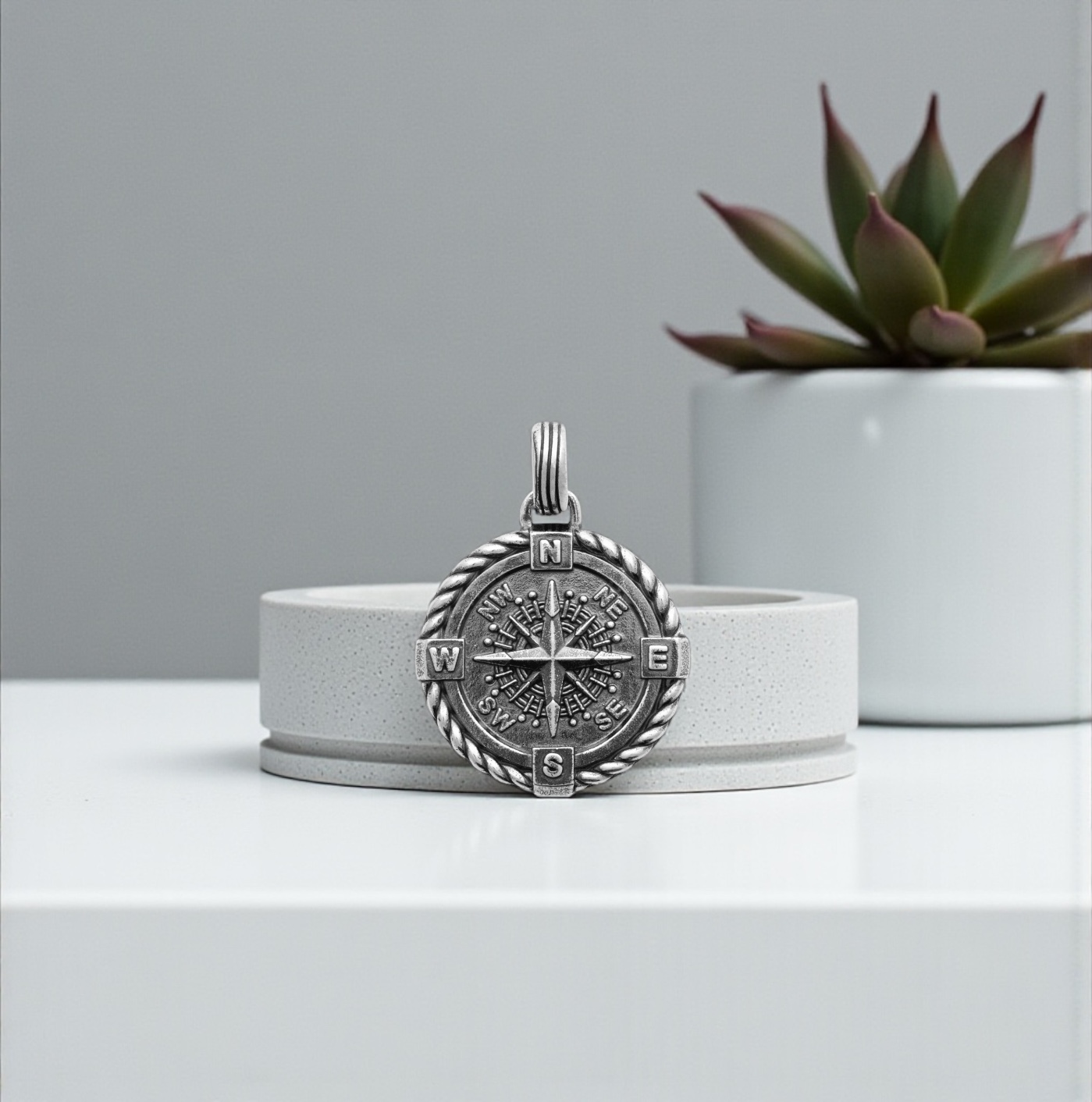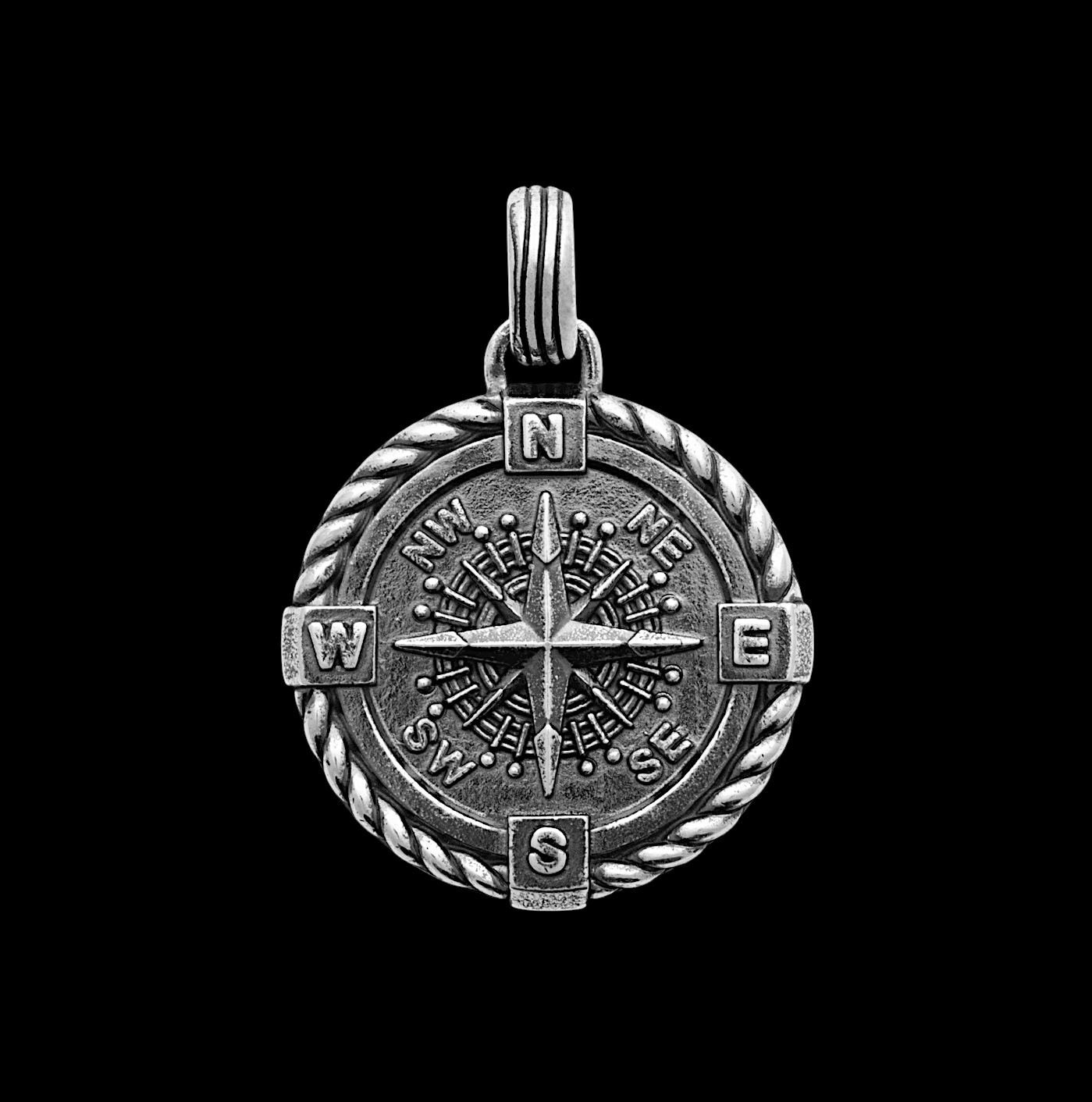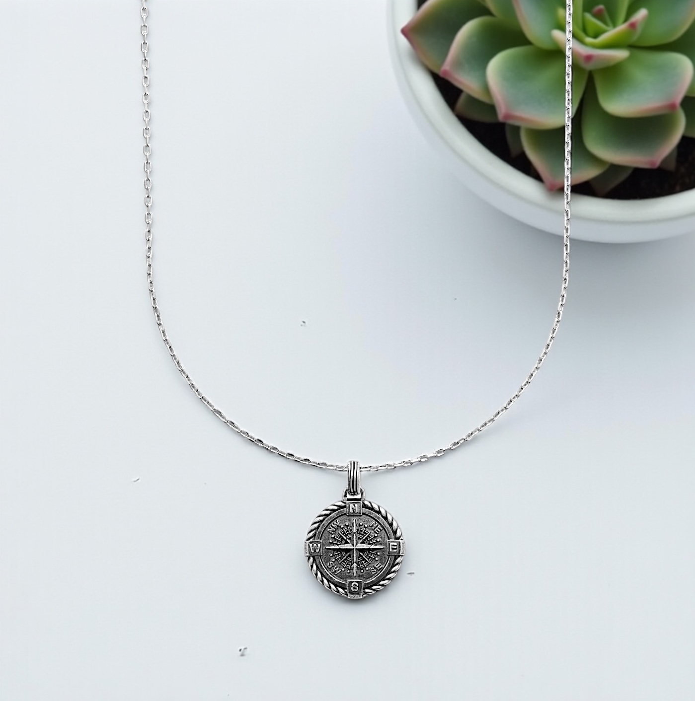 Ce pendentif en argent représente une boussole finement sculptée, symbole universel de direction, de voyage et de liberté. Le médaillon présente une rose des vents détaillée, avec chacune des directions gravées avec soin. Le contour tressé apporte du relief et une touche d’authenticité, donnant au bijou un style à la fois intemporel et plein de caractère.