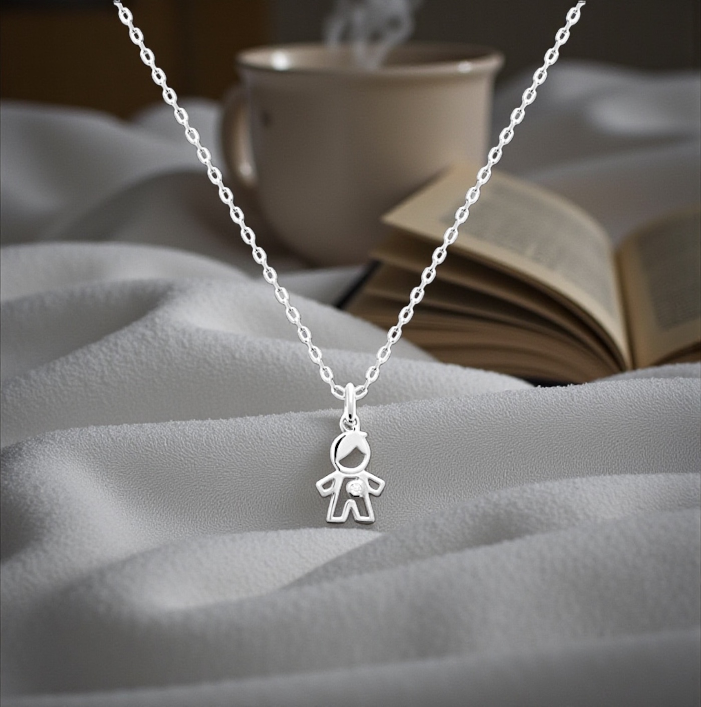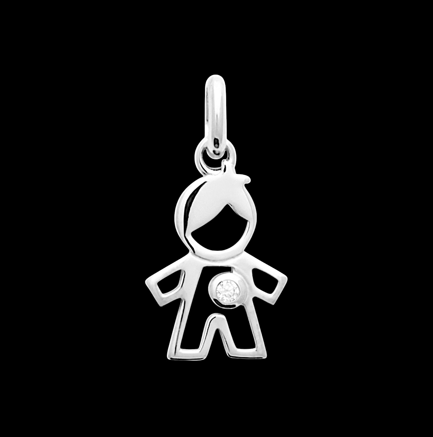 Ce ravissant pendentif en argent rhodié séduit par son design tendre et épuré, représentant un petit garçon stylisé, symbole d’amour, d’attachement et de tendres souvenirs. Au centre de sa silhouette, un oxyde de zirconium étincelant apporte une touche lumineuse et délicate, rappelant la pureté et la joie de l’enfance.
