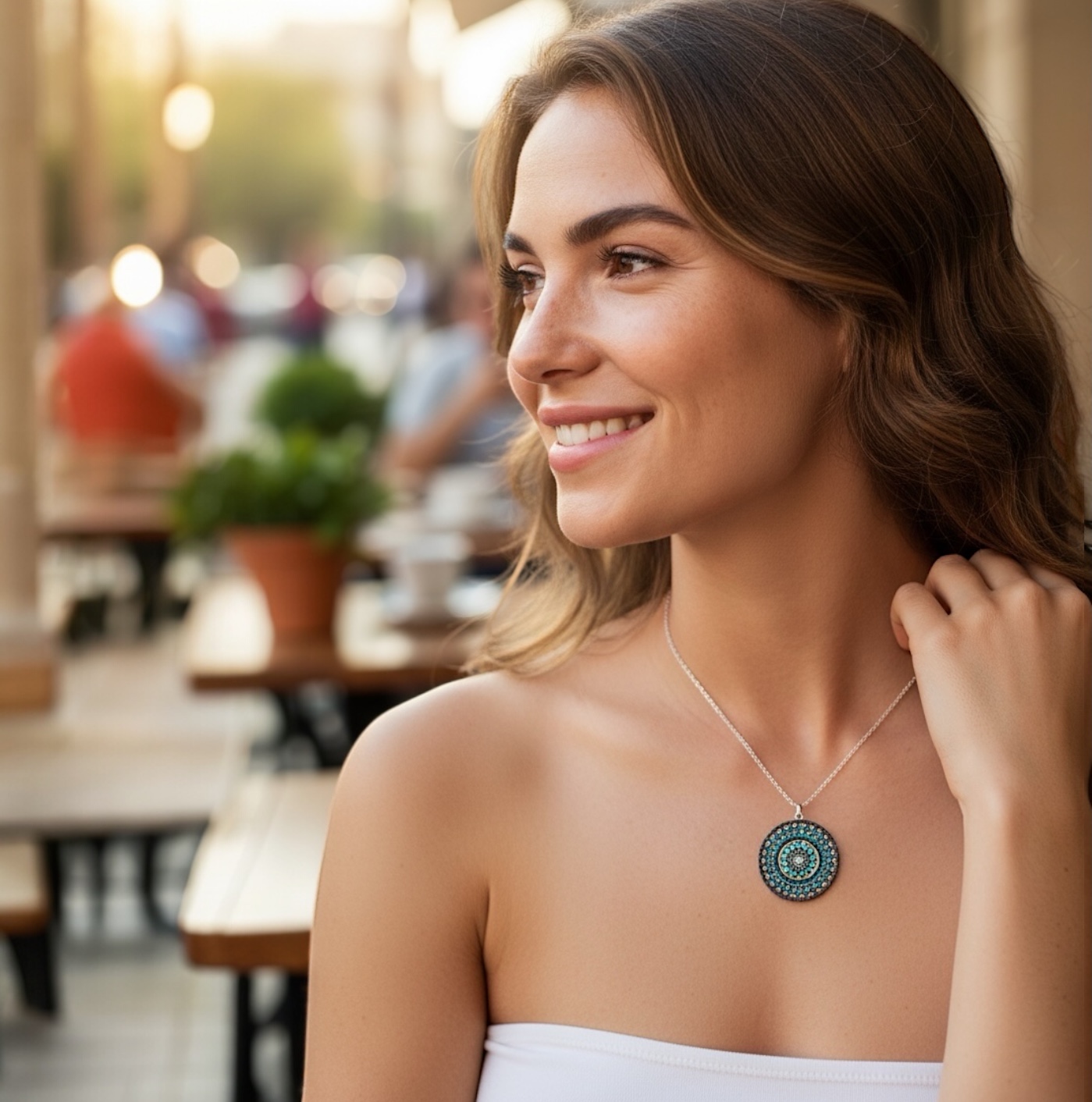 Ce bijou n’est pas seulement esthétique: il porte une symbolique forte. Le mandala représente la force intérieure, la sérénité et l’harmonie. Porté près du cœur, il devient un talisman moderne, une source d’équilibre et de lumière.