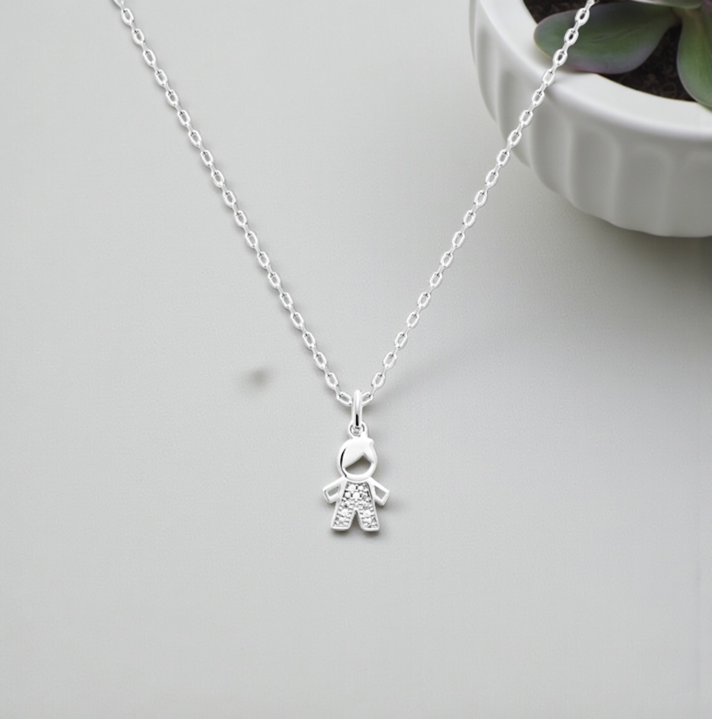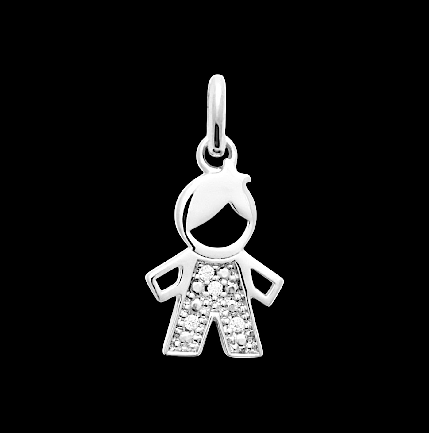 Ce charmant pendentif en argent rhodié représente un petit garçon stylisé, symbole de tendresse, de souvenirs précieux et d’amour familial. Sa silhouette délicate est sublimée par un pavage d’oxydes de zirconium étincelants, qui apporte une lumière douce et raffinée à l’ensemble. Chaque éclat reflète la joie, l’innocence et la pureté de l’enfance.