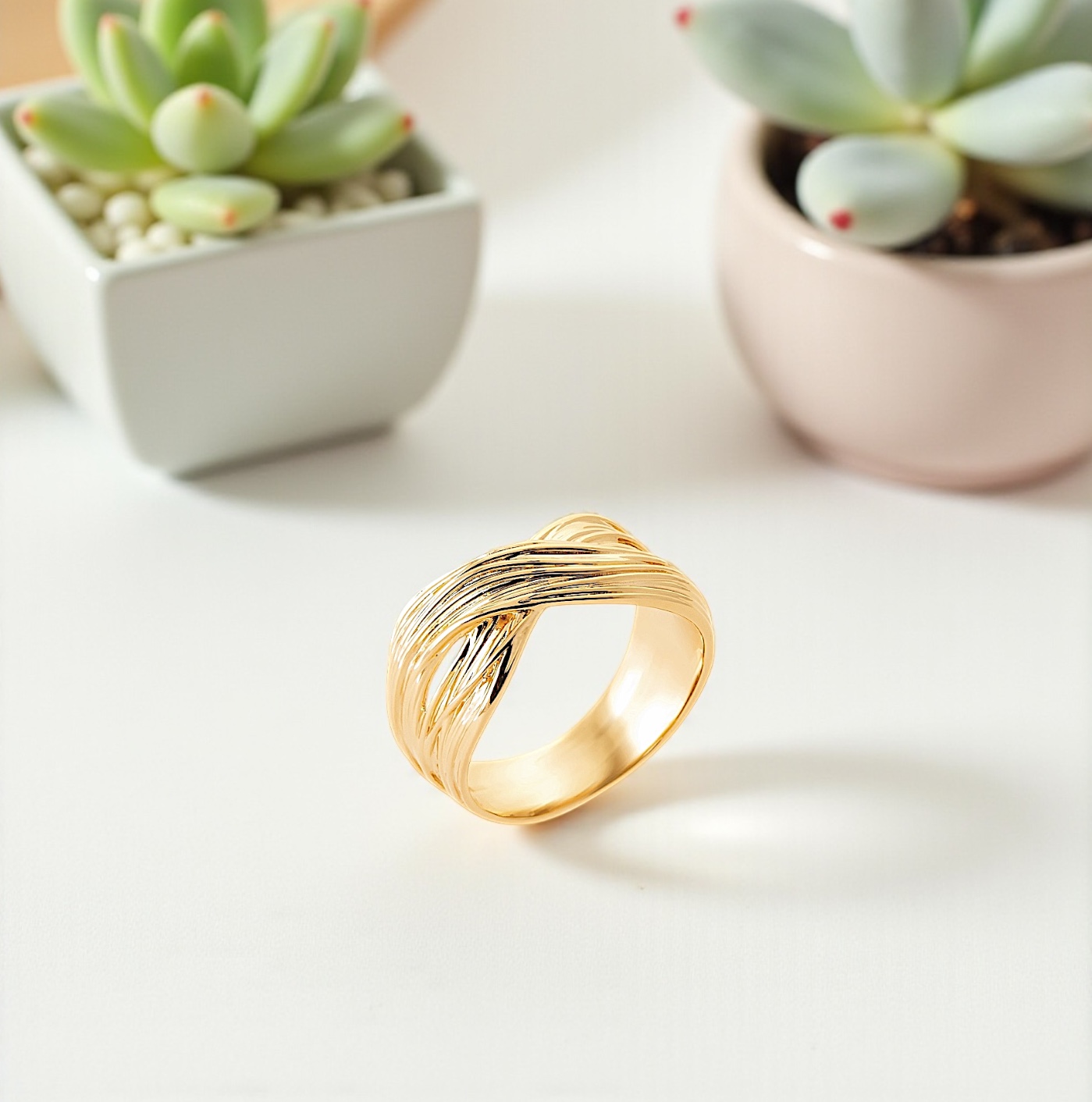 Découvrez cette somptueuse bague au design raffiné et contemporain, réalisée avec un plaquage en or 18 carats de haute qualité. Son motif entrelacé, à l’effet torsadé élégant, joue avec la lumière grâce à ses lignes finement sculptées, offrant un éclat remarquable à chaque mouvement.
