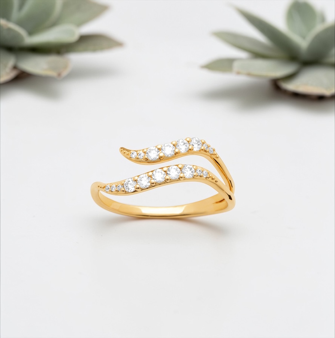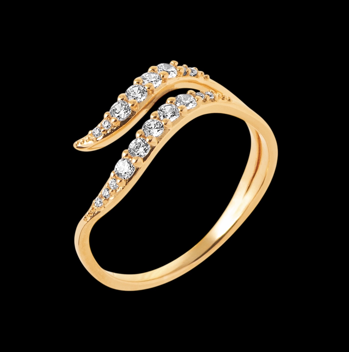 Son design aérien et contemporain se distingue par ses deux lignes délicatement courbées, entièrement serties d’oxydes de zirconium scintillants. Chaque pierre capte la lumière avec intensité, créant un jeu d’éclats subtil et sophistiqué qui attire le regard sans jamais en faire trop. L’harmonie parfaite entre la douceur des courbes et la brillance des pierres confère à cette bague une allure à la fois élégante et résolument féminine.