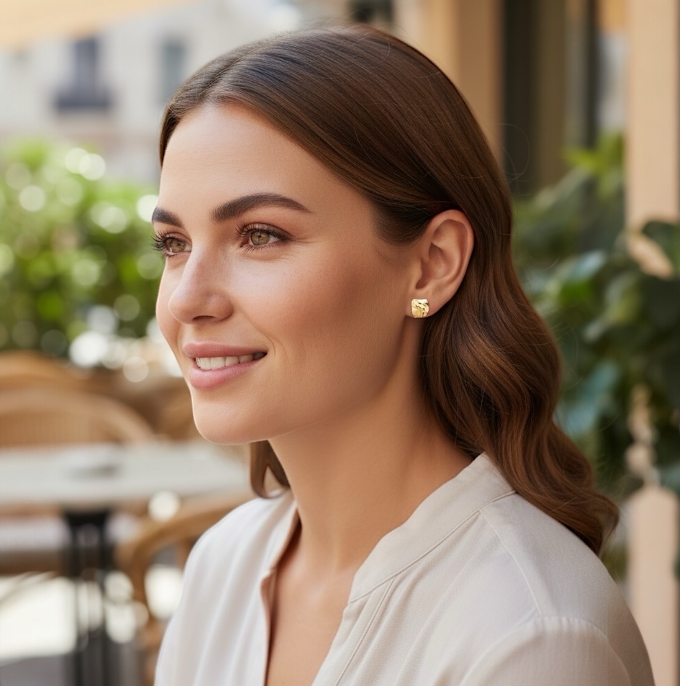 Leur forme carrée aux lignes douces capte la lumière avec subtilité, offrant un jeu d’éclats raffiné à chaque mouvement.