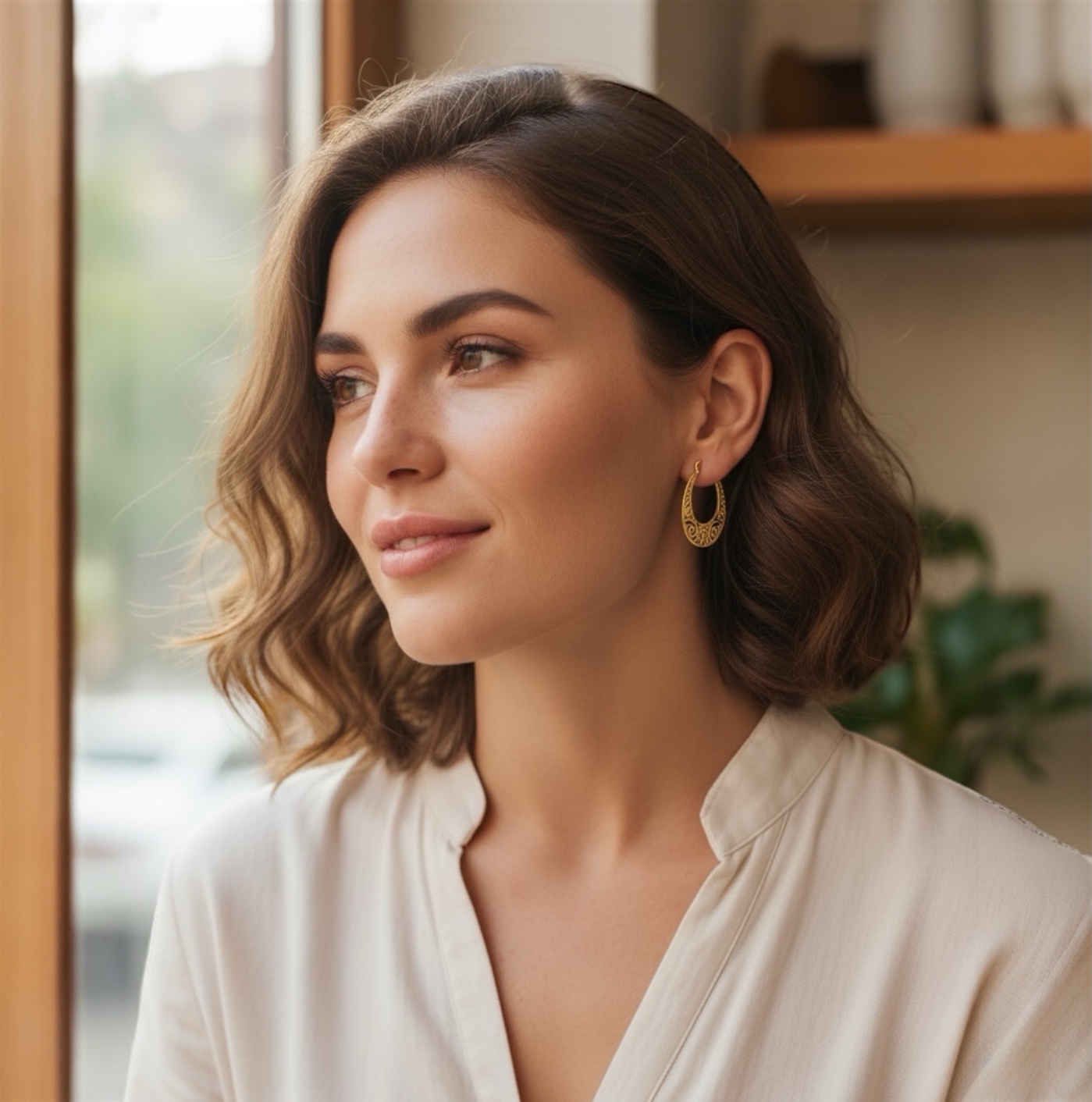 Ces créoles plaquées or 18 carats séduisent par leur forme ovale originale et leur délicat motif ajouré d’inspiration orientale. Le travail minutieux de la gravure crée un jeu de courbes et d’arabesques qui évoque à la fois élégance, féminité et raffinement.