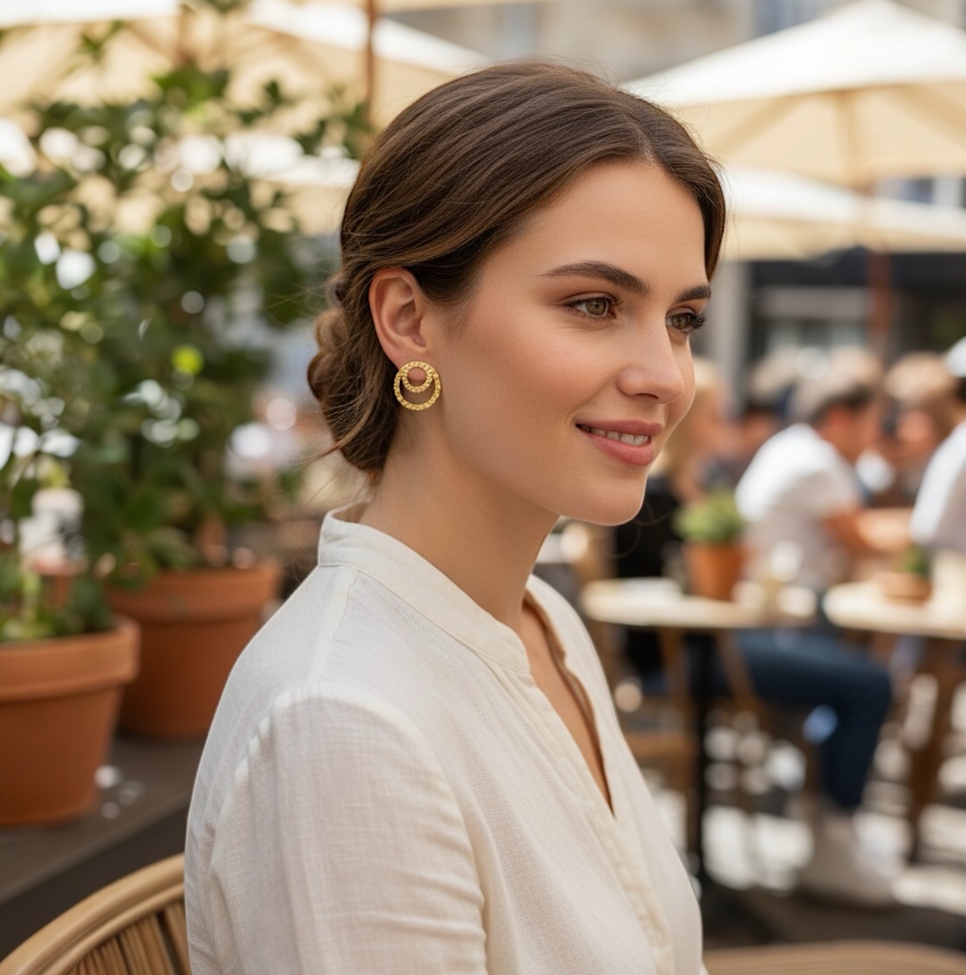 Composées de deux cercles entrelacés à la texture martelée et scintillante, elles captent la lumière à chaque mouvement pour sublimer votre visage.