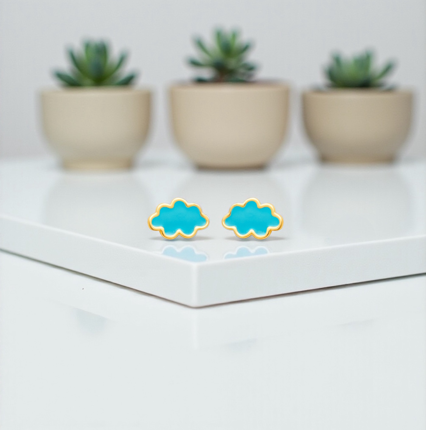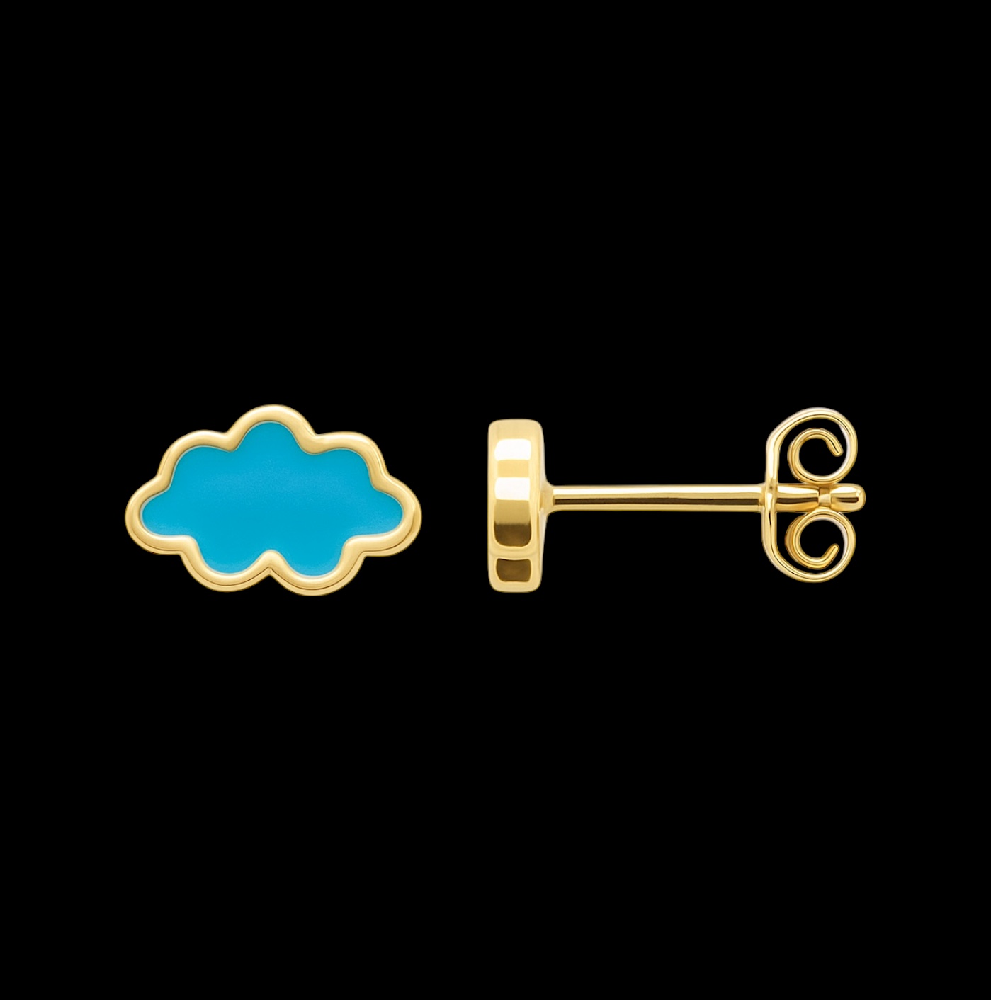 Ces adorables boucles d’oreilles en plaqué or 18 carats séduisent instantanément par leur forme douce de petit nuage et leur finition en laque bleue éclatante. Leur design rond, tendre et parfaitement lisse reflète l’innocence et la poésie de l’enfance, tout en apportant une touche de couleur joyeuse et lumineuse.