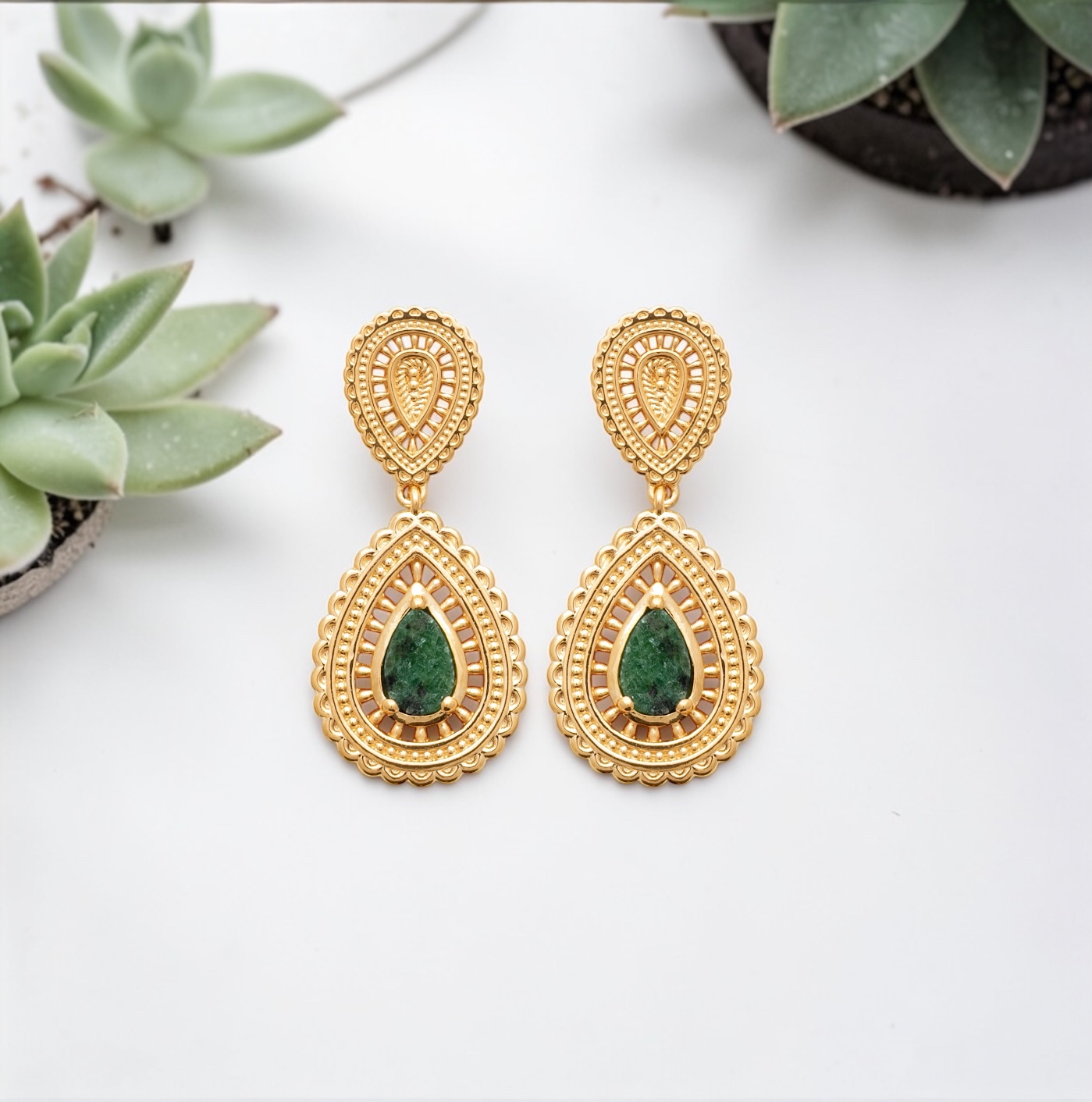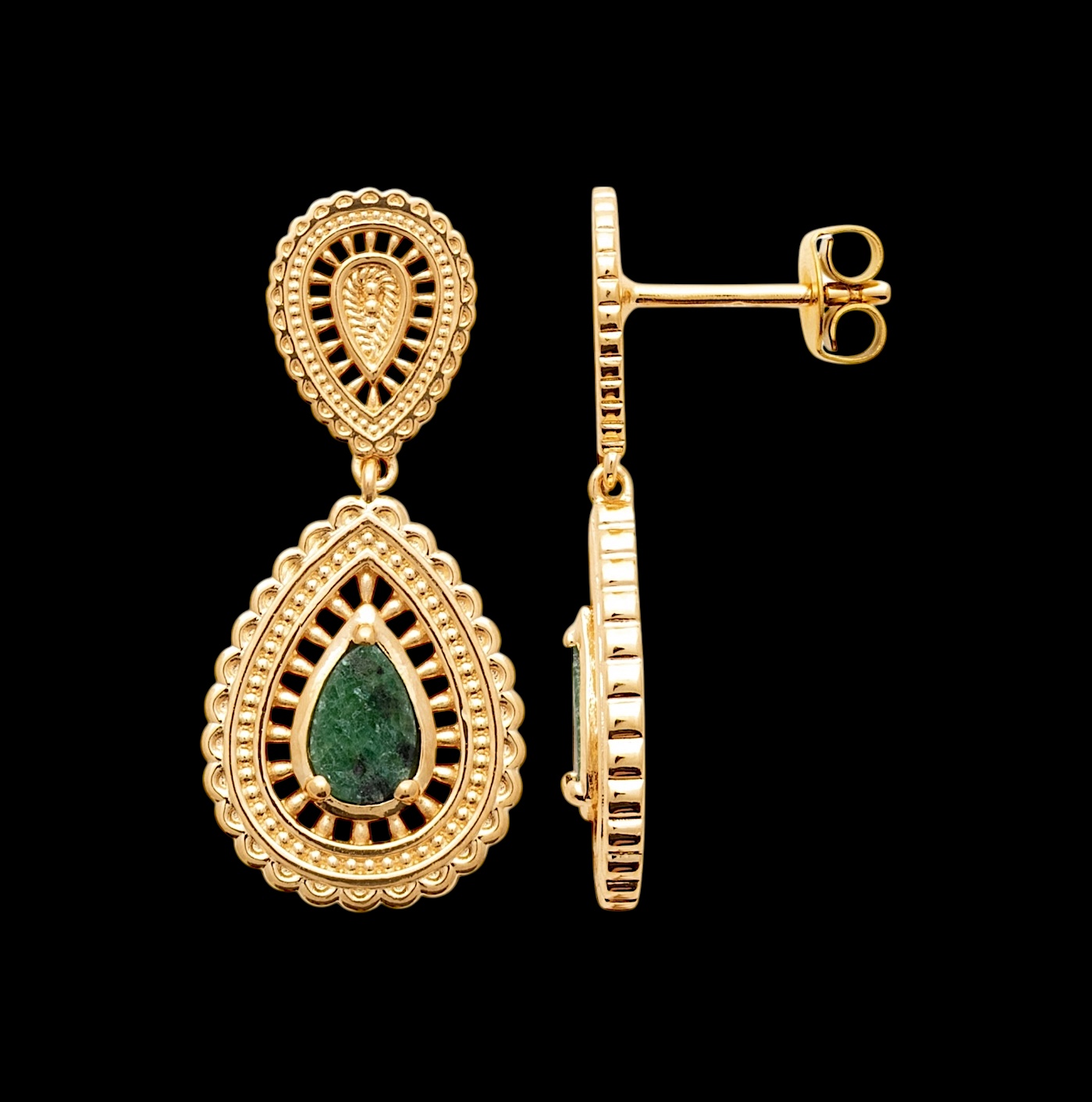 Leur design en forme de goutte se distingue par une structure finement ajourée, délicatement ciselée, qui laisse apparaître en son cœur une pierre de jaspe dalmatien. Unique par ses nuances naturelles, cette pierre apporte du caractère au bijou et souligne son authenticité. Chaque détail, du contour travaillé aux reliefs subtils, témoigne d’un savoir-faire soigné et d’un sens aigu du détail.