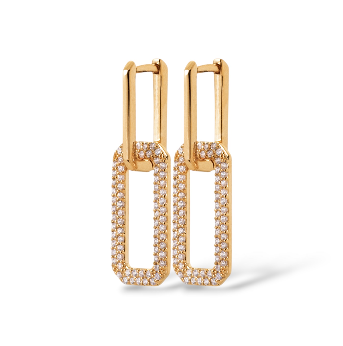 Ces boucles d’oreilles en plaqué or 18 carats séduisent par leur design graphique, à la fois audacieux et raffiné. Composées de deux maillons rectangulaires, elles jouent sur les contrastes et les volumes pour offrir une allure résolument contemporaine. Le maillon supérieur, lisse et brillant, apporte une touche de sobriété, tandis que le maillon inférieur est entièrement pavé d’oxydes de zirconium qui captent la lumière avec intensité. Chaque mouvement révèle l’éclat des pierres, pour un effet lumineux et élégant.