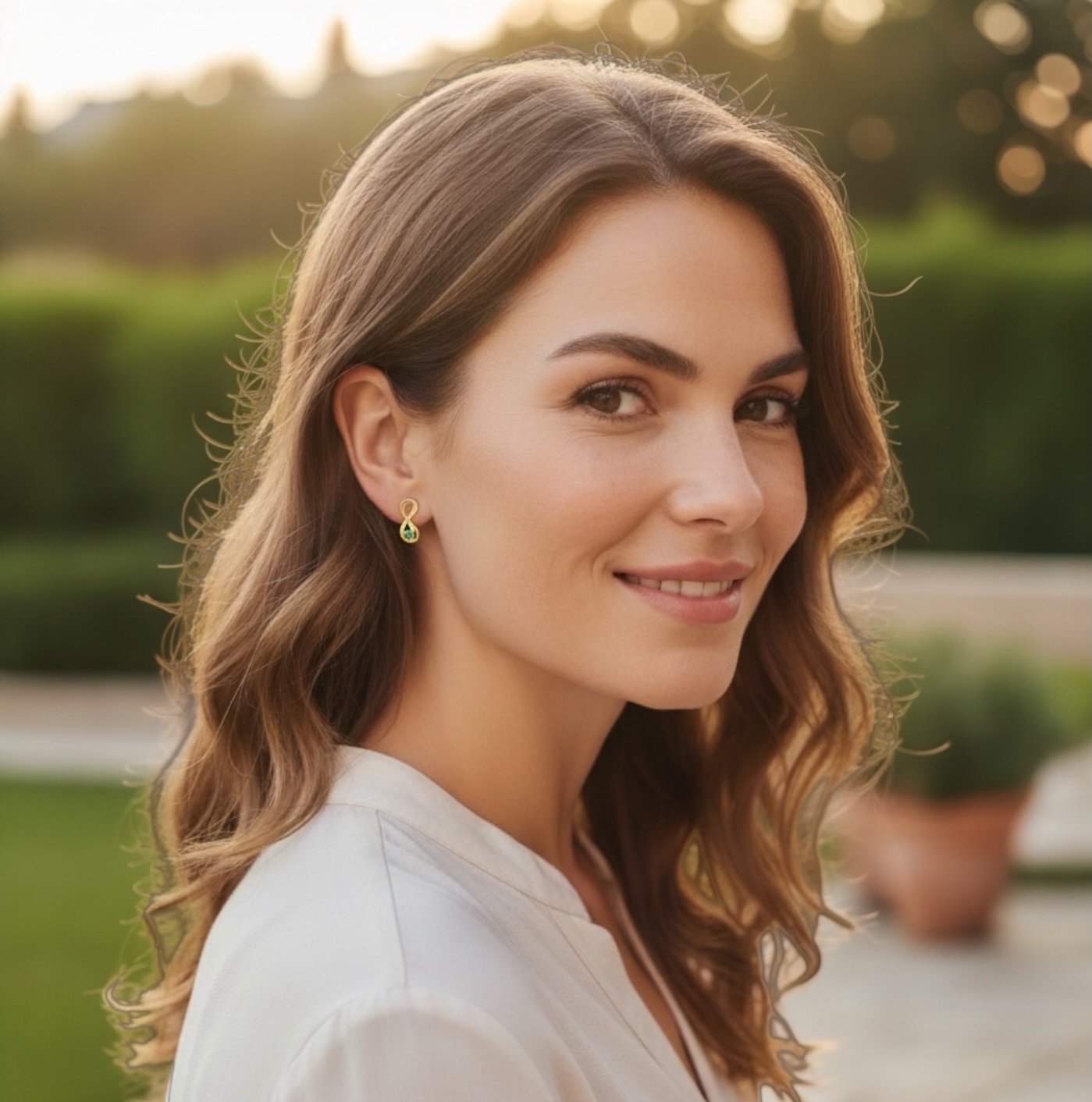 Réalisées en plaqué or 18 carats lumineux, ces boucles au style délicat sont sublimées par un oxyde de zirconium vert éclatant, soigneusement serti au cœur de chaque boucle. La pierre capte la lumière avec subtilité pour révéler des reflets d’une intensité captivante.