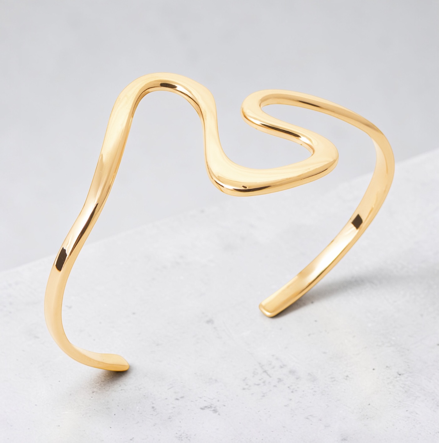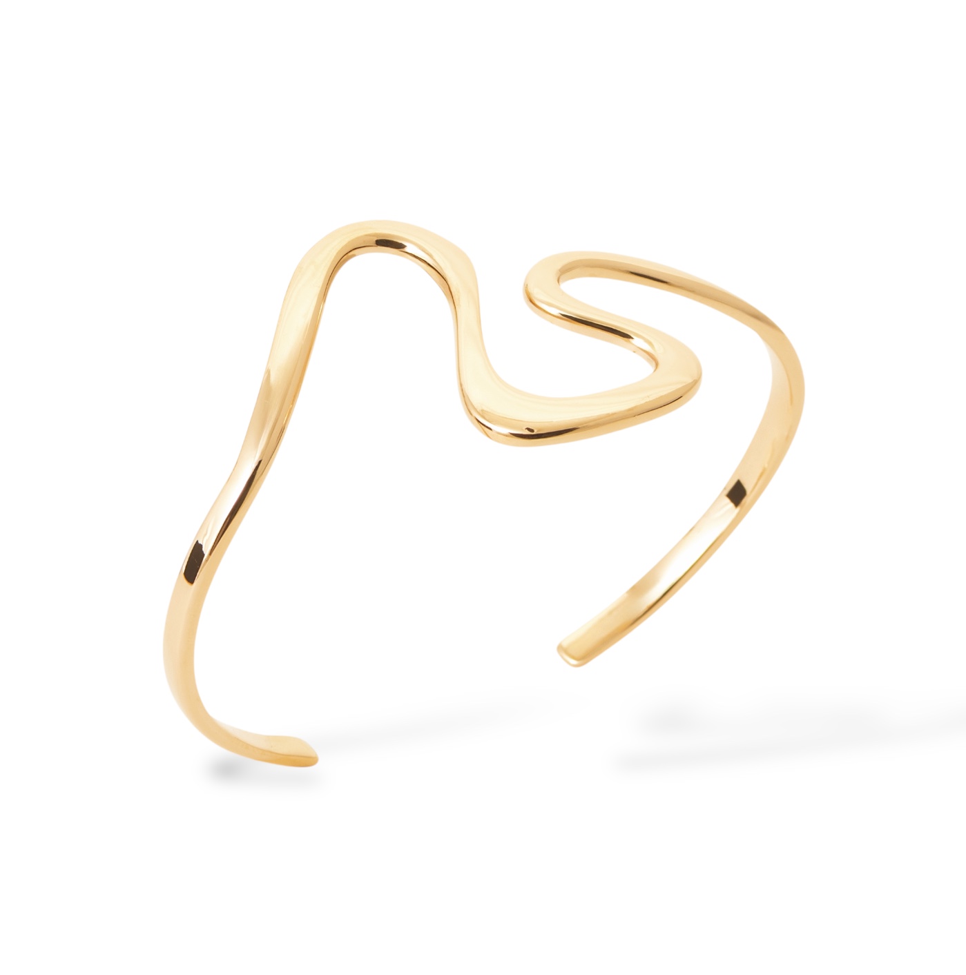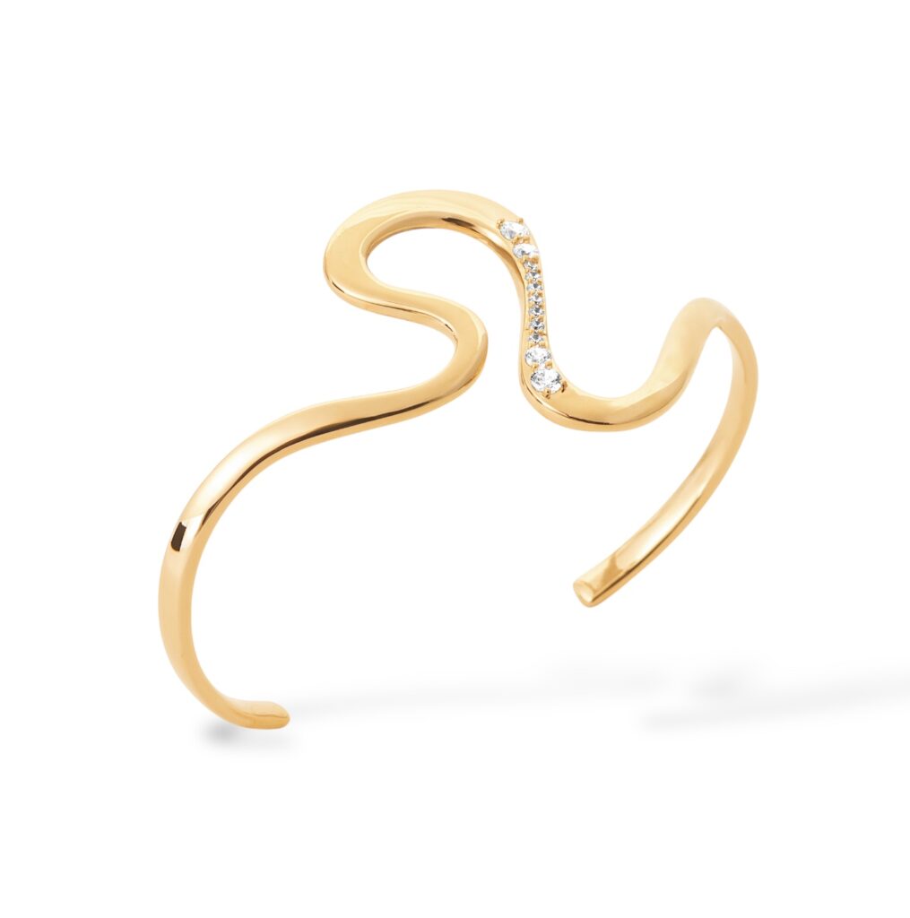 Ce jonc en plaqué or 18 carats, d’un diamètre de 58 mm, séduit par ses lignes fluides et son design résolument moderne. Sa silhouette ouverte, délicatement ondulée, évoque le mouvement naturel des vagues, apportant une touche de douceur et d’originalité au poignet.