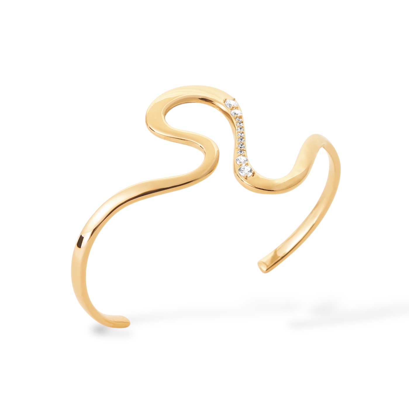 Ce jonc en plaqué or 18 carats, d’un diamètre de 58 mm, incarne l’élégance contemporaine dans toute sa finesse. Sa forme ouverte et délicatement ondulée dessine une ligne fluide et aérienne, comme un mouvement naturel qui épouse avec grâce le poignet.