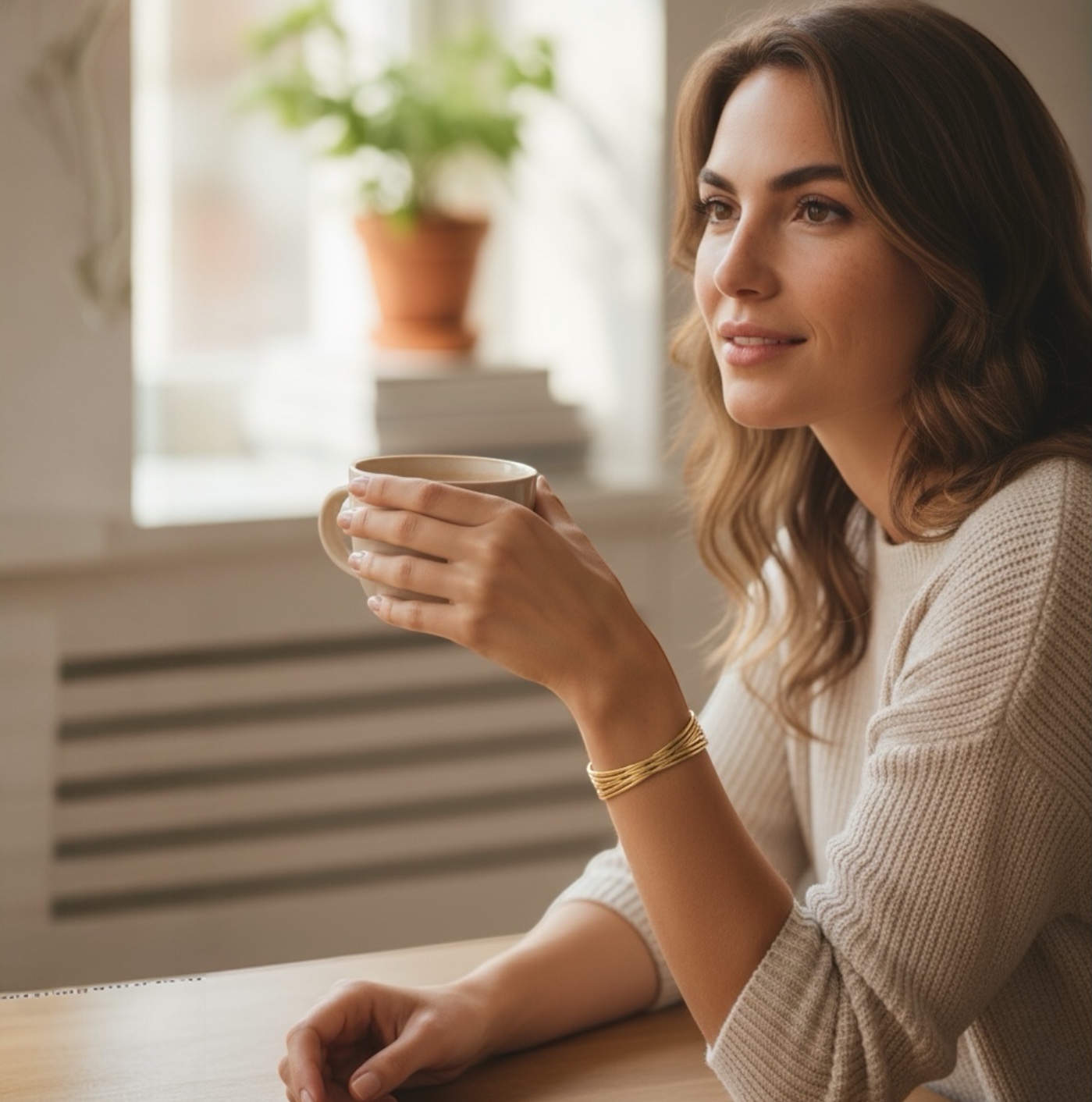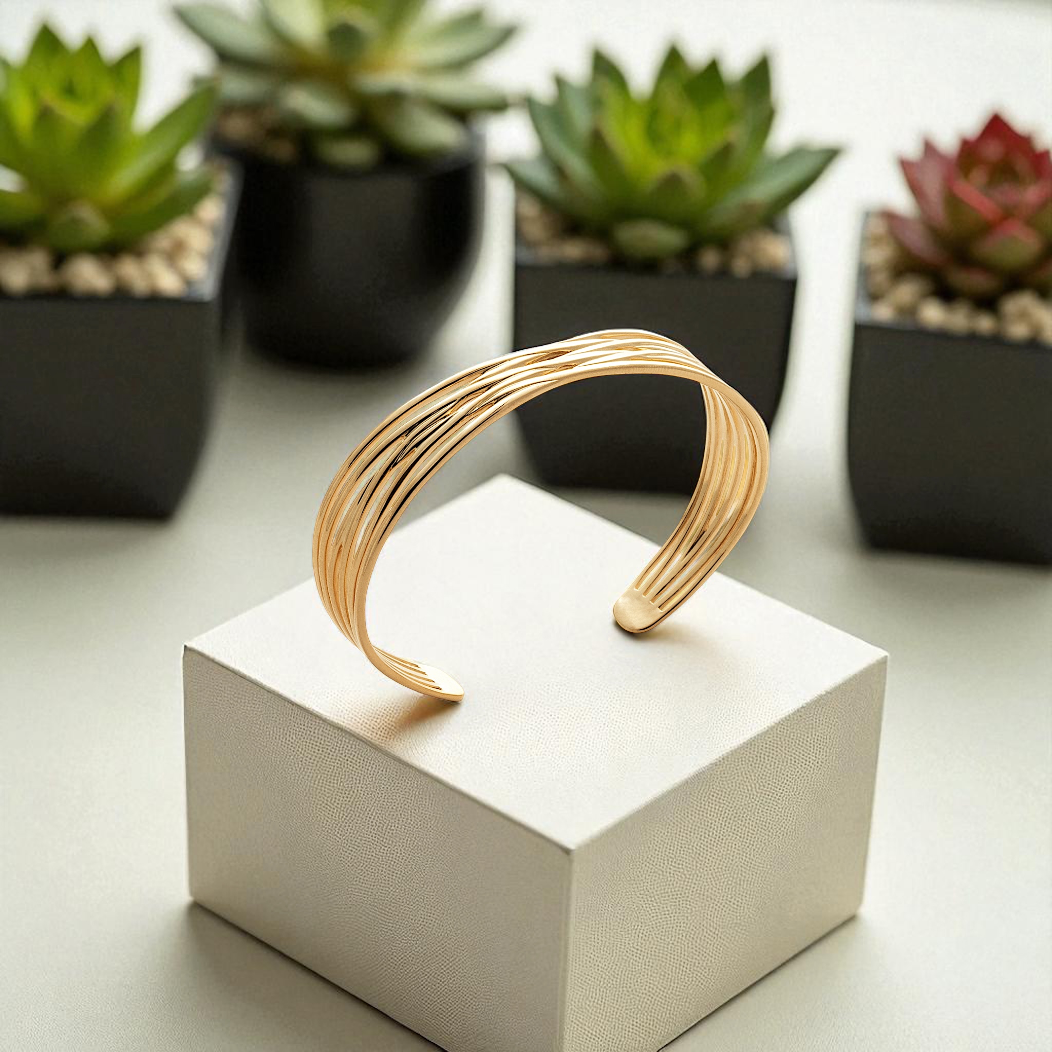 Sublimez votre poignet avec ce bracelet jonc en plaqué or 18 carats, au design épuré et résolument contemporain. Composé de plusieurs fils finement entrelacés, il dessine un jeu de courbes fluides et élégantes, sublimé par la brillance chaude et lumineuse de l’or. La dorure de haute qualité assure une tenue parfaite dans le temps tout en apportant une touche précieuse et intemporelle.