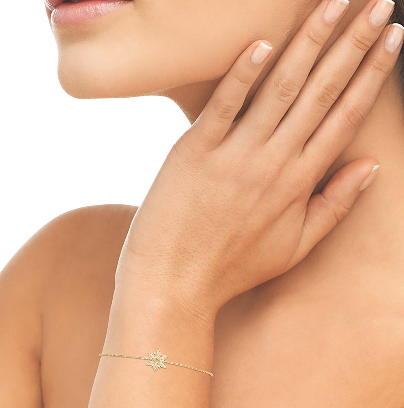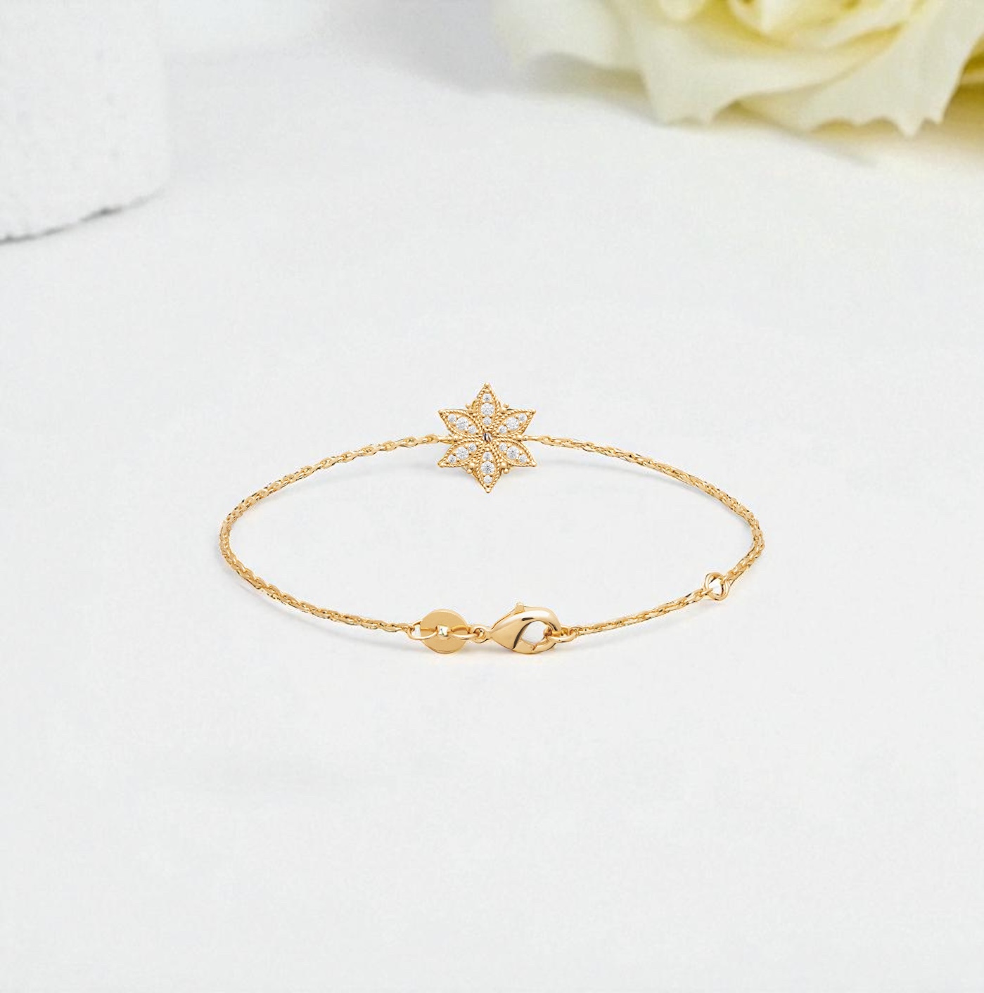 Craquez pour la délicatesse et le raffinement de ce bracelet au design floral, véritable ode à la féminité. En son centre, une sublime fleur à six pétales déploie ses courbes élégantes, sertie d’oxydes de zirconium éclatants qui imitent à la perfection la brillance du diamant.