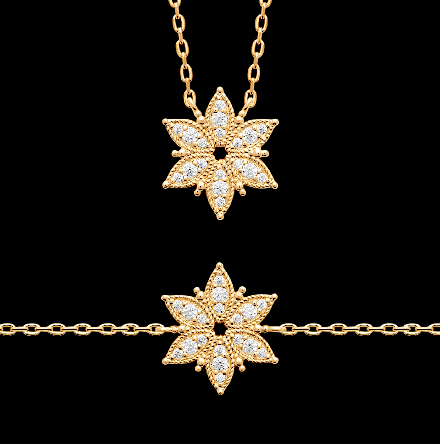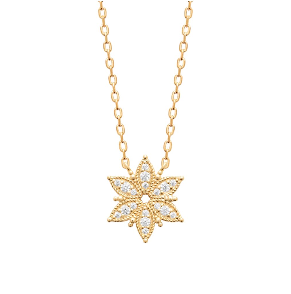 Conçu avec un soin minutieux, ce bijou est réalisé en plaqué or 18 carats, offrant une finition luxueuse, lumineuse et durable. Son éclat doré rehausse les reflets scintillants des pierres, pour un rendu à la fois chic et intemporel. Chaque détail du motif floral est finement travaillé, avec des contours perlés qui ajoutent une touche précieuse à l’ensemble.