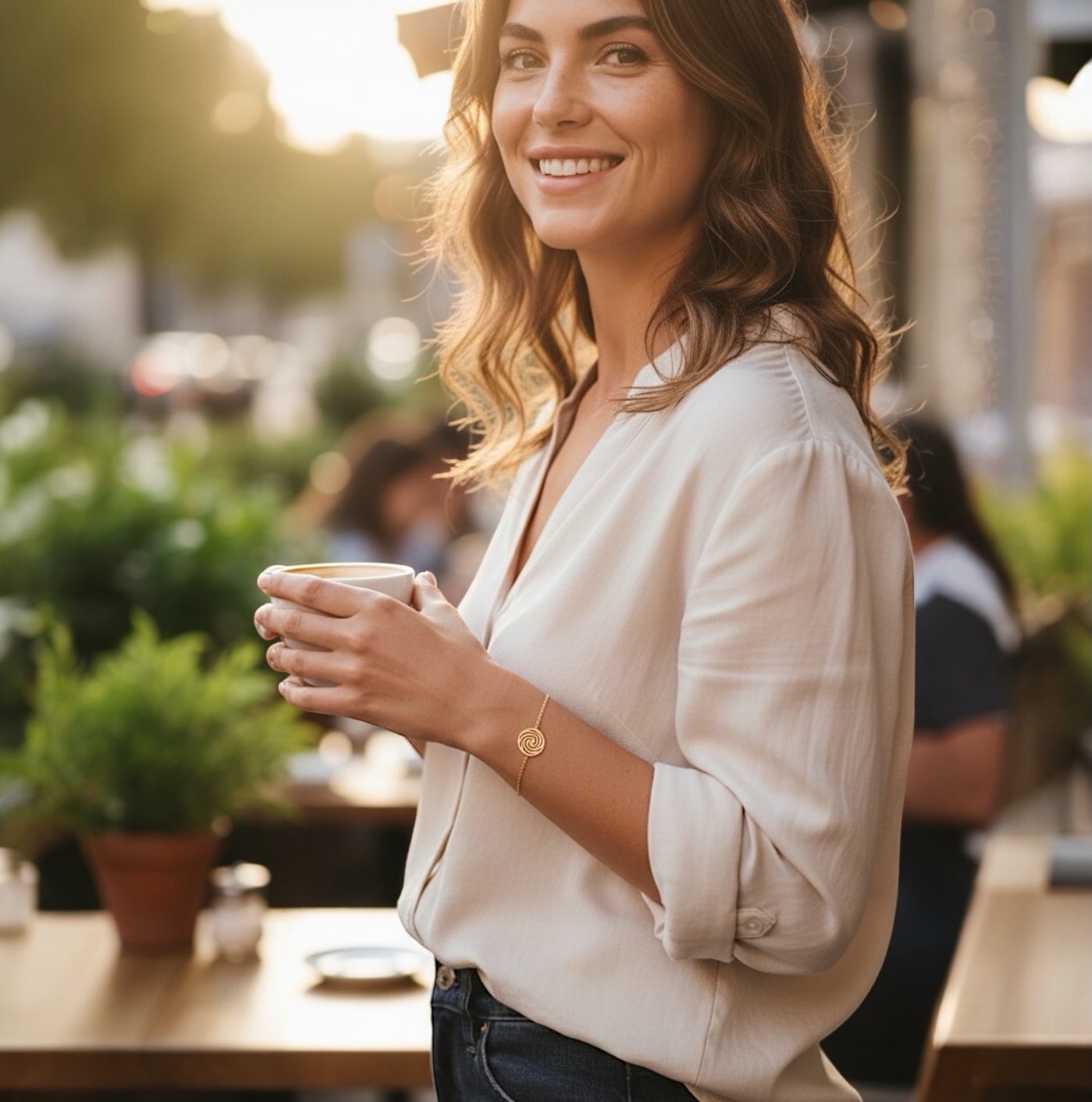 Découvrez ce bracelet raffiné en plaqué or 18 carats, dont le motif central évoque une spirale ajourée, symbole d’énergie, d’équilibre et de mouvement perpétuel. Son design épuré et contemporain apporte une touche subtile et lumineuse à votre poignet.