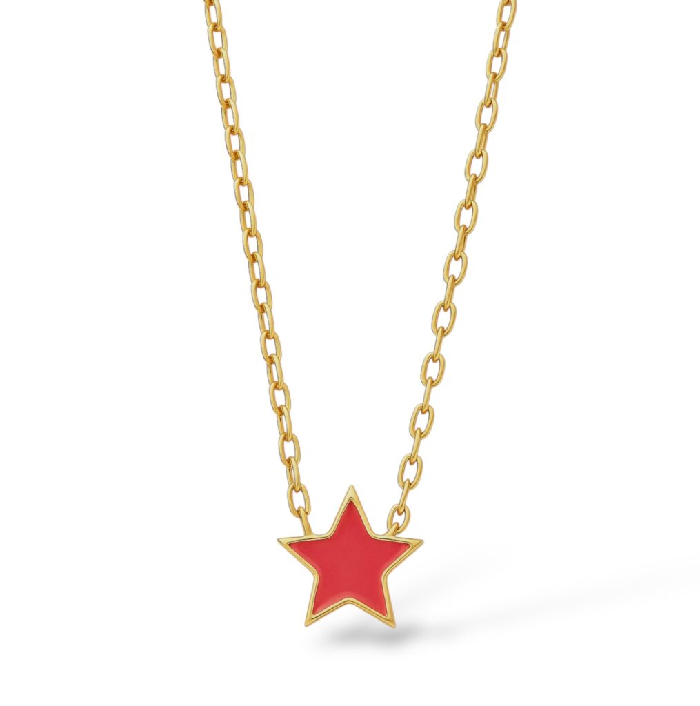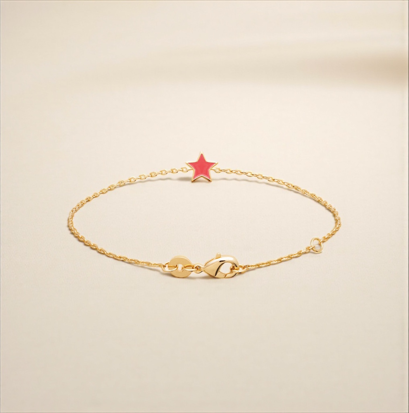 Ce ravissant bracelet a été imaginé pour les enfants qui aiment les bijoux pleins de douceur et de lumière. Réalisé en plaqué or 18 carats, il se compose d’une fine chaîne élégante de 16 cm, parfaitement adaptée aux poignets des plus jeunes. En son centre, une jolie étoile attire tous les regards grâce à sa laque rose éclatante, appliquée avec soin pour un rendu lisse, brillant et plein de gaieté. La bordure dorée souligne avec finesse la silhouette de l’étoile, créant un contraste harmonieux et lumineux.