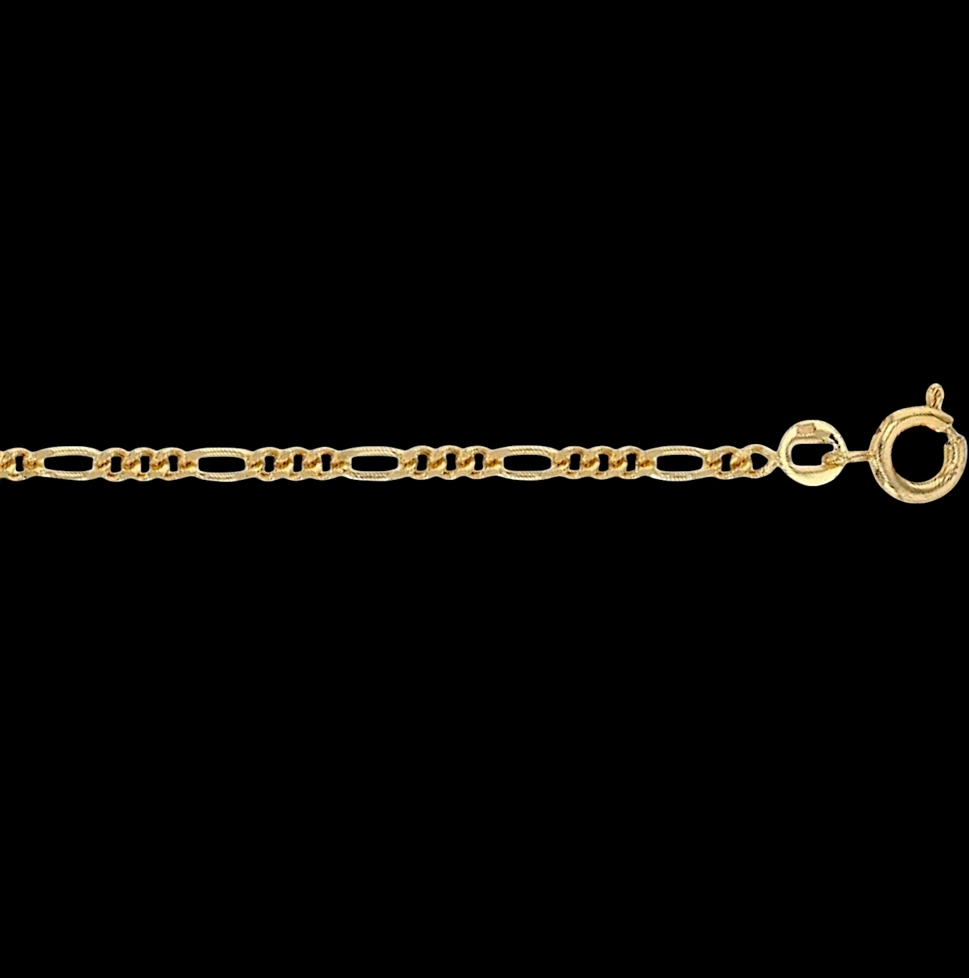 La maille Figaro triple se distingue par son alternance de maillons allongés et de maillons plus petits, disposés de façon régulière, offrant ainsi un équilibre parfait entre dynamisme et élégance. Chaque maillon long est encadré par trois maillons plus petits, créant un motif unique qui capte la lumière et apporte de la texture à la chaîne. Cette structure confère à la chaîne à la fois légèreté et résistance, tout en offrant un confort optimal grâce à sa souplesse.
