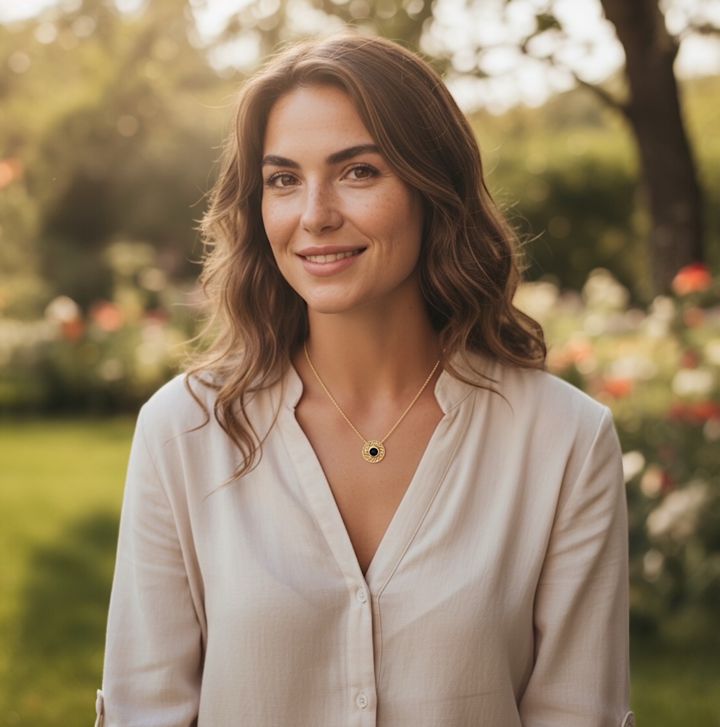 Découvrez ce magnifique collier plaqué or 18 carats, orné d’une splendide agate noire au cœur d’un pendentif circulaire au design ajouré évoquant la nature et l’élégance. Long de 45 cm, ce bijou combine finesse et originalité, offrant un éclat profond et mystérieux grâce à la pierre d’agate noire, symbole de force et de protection.