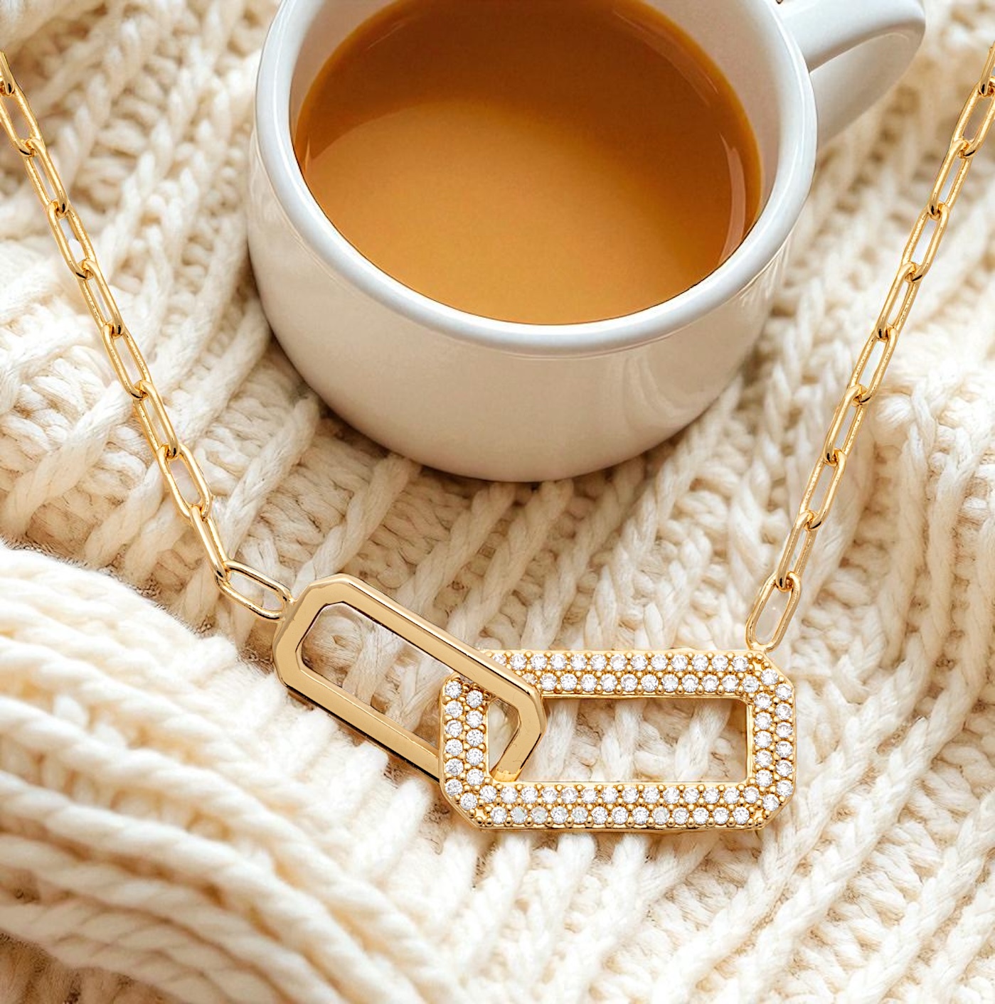 Ce collier en plaqué or 18 carats séduit par son design contemporain et raffiné. Son pendentif met en scène deux maillons rectangulaires entrelacés : l’un au fini poli, reflétant avec intensité la chaleur de l’or, et l’autre entièrement pavé d’oxydes de zirconium étincelants. Ce contraste subtil entre sobriété et brillance crée un bijou à la fois moderne et intemporel.