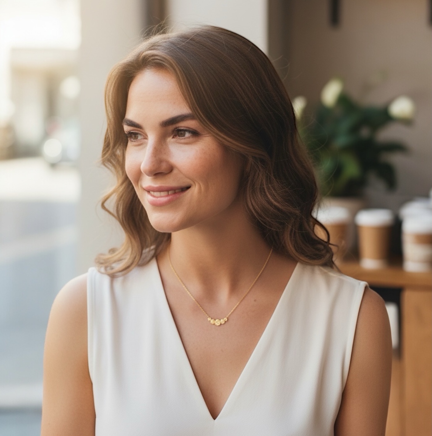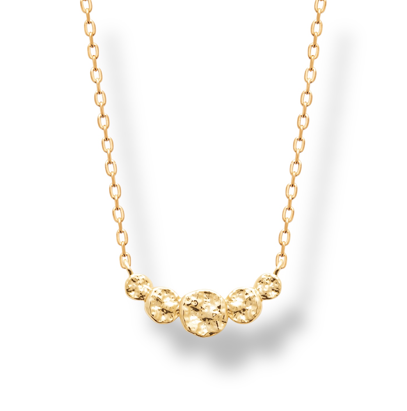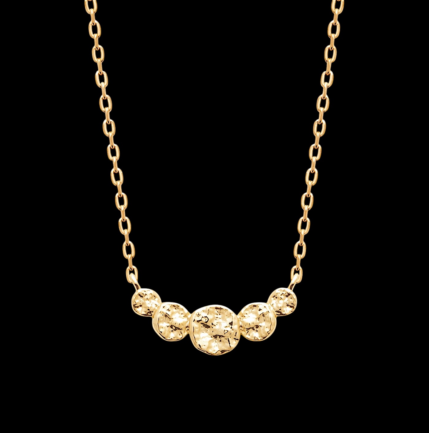 Son design délicat se compose de cinq pastilles martelées aux reflets lumineux, disposées en dégradé au centre de la chaîne. Chaque pastille reflète la lumière avec subtilité, créant un jeu d’éclats à la fois chic et moderne, parfait pour illuminer votre décolleté.