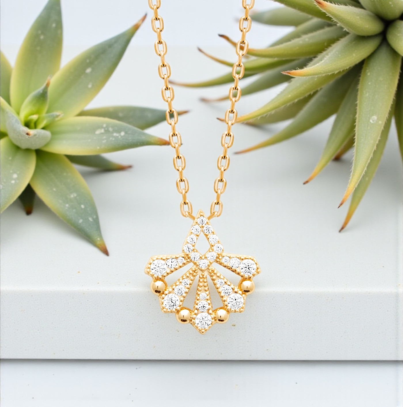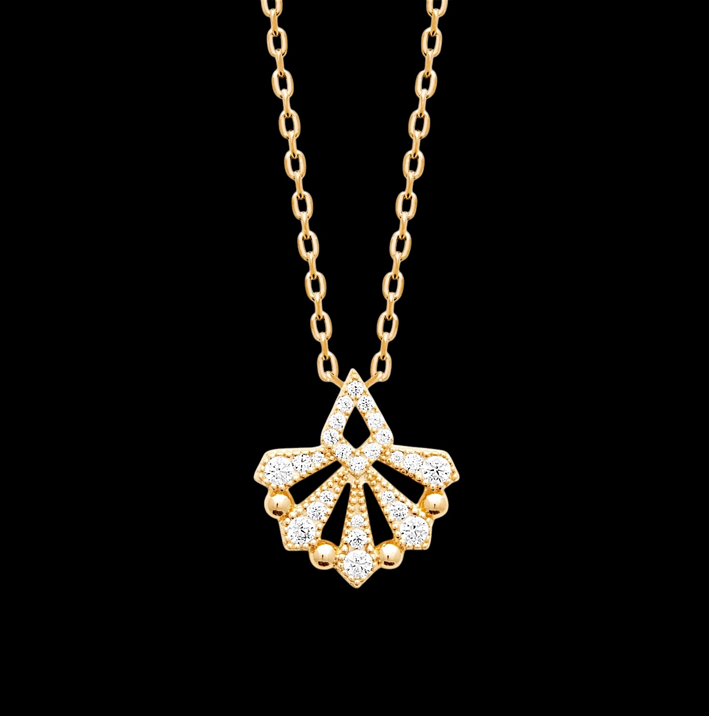 Ce collier en plaqué or 18 carats est une véritable ode à la lumière et à l’élégance. Son pendentif, finement travaillé, adopte une forme éventail délicate aux lignes géométriques, sublimée par un pavage d’oxydes de zirconium éclatants. Chaque pierre capte la lumière avec intensité, créant un jeu de reflets précieux qui illumine instantanément le décolleté.