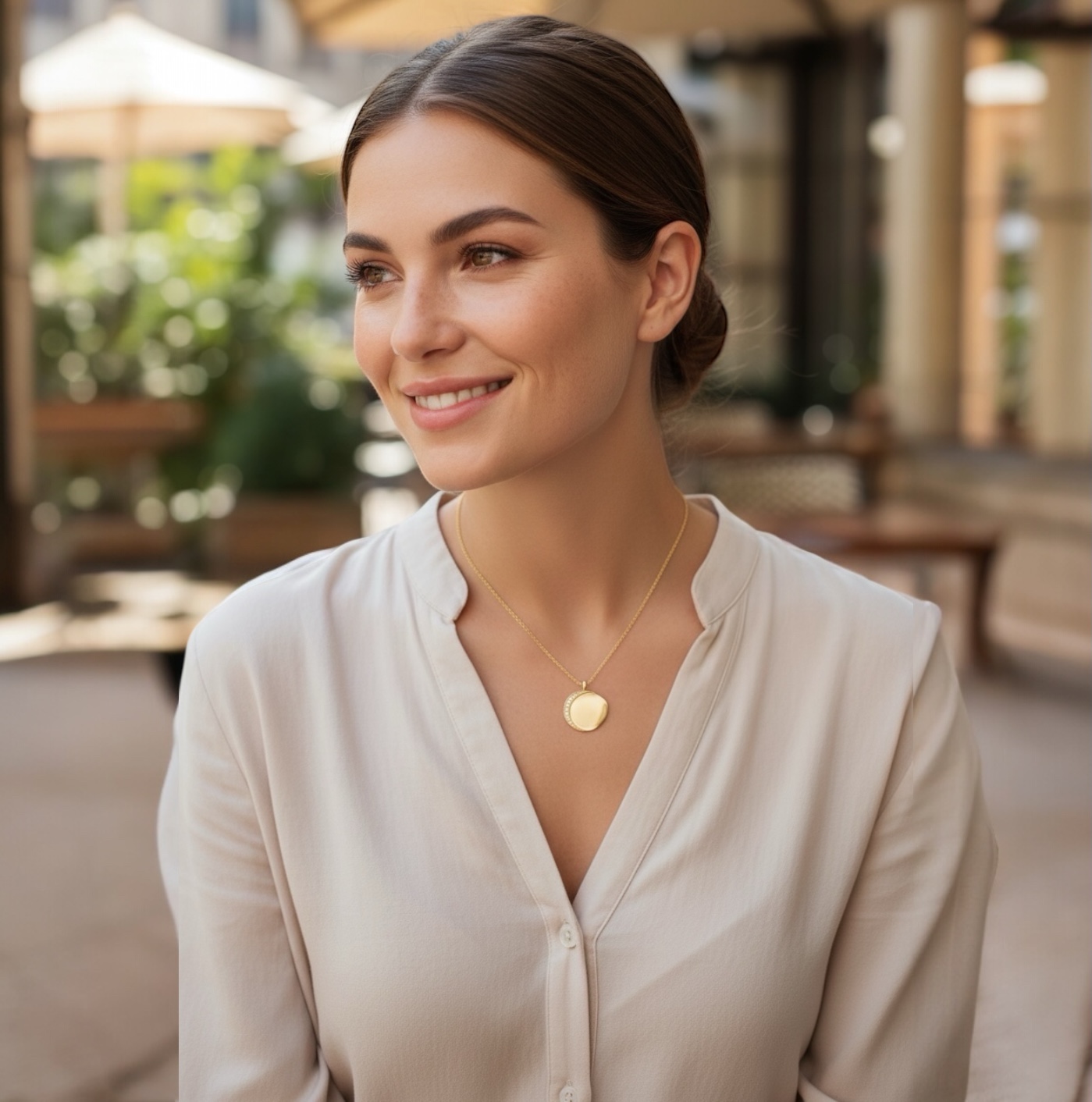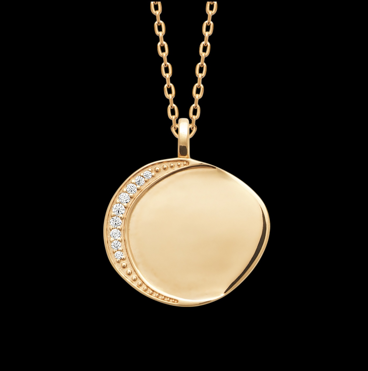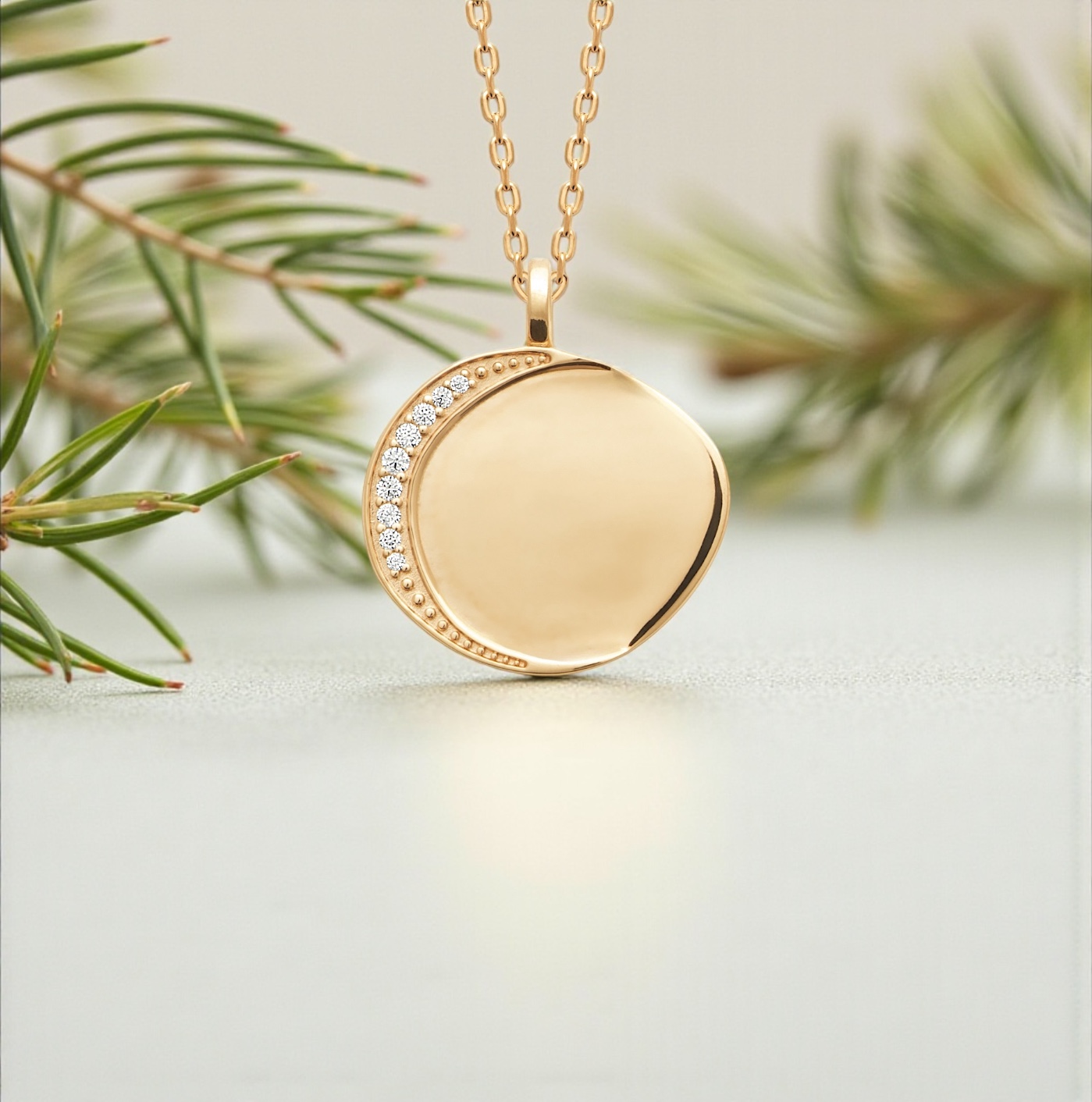 Le contraste entre la brillance lisse du médaillon et l’éclat cristallin des pierres crée une harmonie parfaite entre sobriété et sophistication. Le plaqué or 18 carats révèle une teinte chaude et lumineuse, gage d’un bijou à la fois précieux et durable.