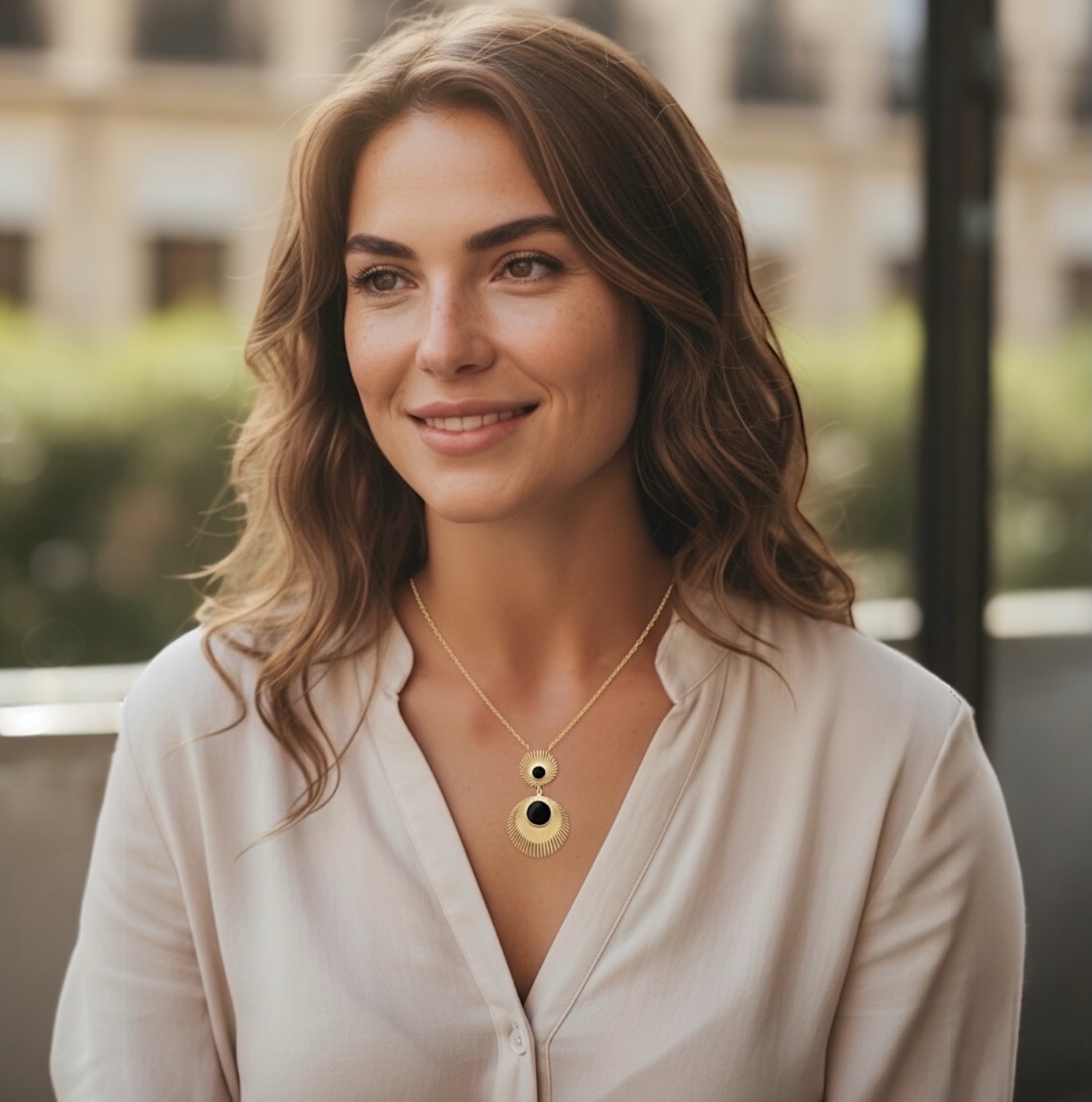 Ce collier plaqué or 18 carats de 45 cm séduit par son design éclatant et sa symbolique forte. Inspiré du rayonnement solaire, il met en scène deux superbes médaillons solaires ornés chacun d’une agate noire profonde et brillante. Le contraste entre la luminosité de l’or et l’intensité de la pierre crée un effet visuel saisissant, à la fois chic et magnétique.