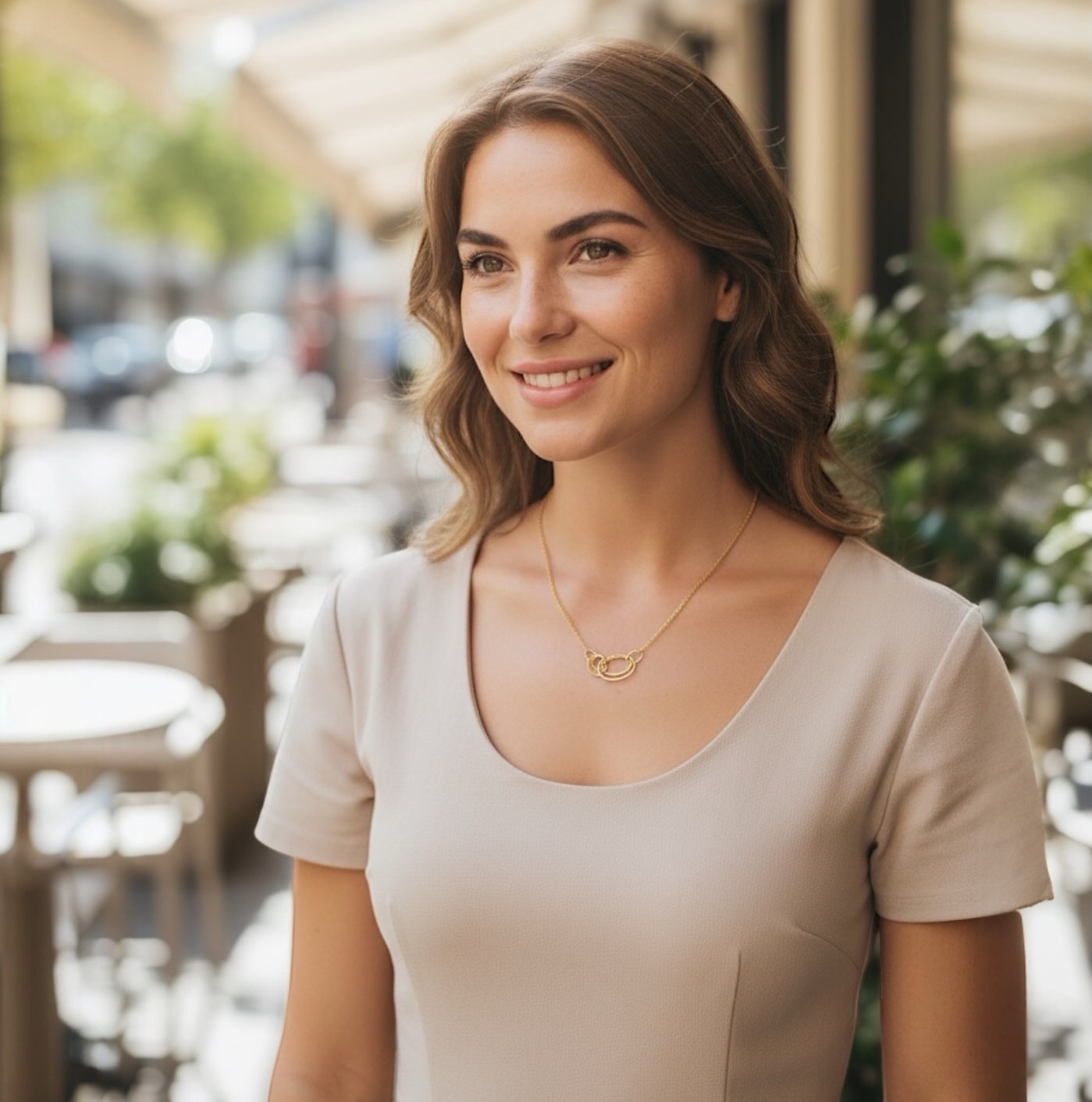 Ce collier plaqué or 18 carats séduit par la finesse et l’équilibre de son design. Composé d’un jeu d’anneaux entrelacés aux textures contrastées – torsadées, perlées et lisses – il apporte une dimension sculpturale tout en conservant une grande légèreté visuelle. Chaque élément est travaillé avec précision, créant un bijou à la fois moderne et raffiné, pensé pour capter la lumière et sublimer votre décolleté.