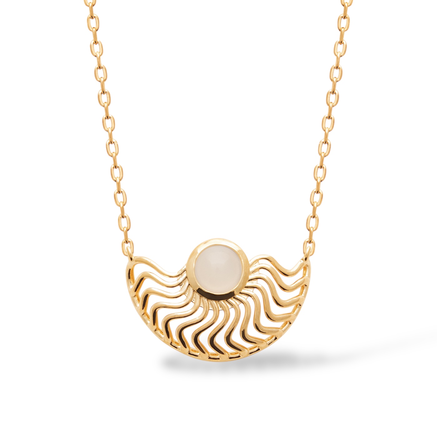 Son pendentif, au design ajouré et harmonieusement structuré, évoque un soleil stylisé aux lignes fluides et rayonnantes. En son centre, une pierre de lune délicatement sertie diffuse une lumière douce et nacrée, créant un contraste subtil avec l’éclat du métal. Les courbes ondulées qui l’entourent semblent danser autour de la pierre, capturant la lumière et donnant au bijou une dimension vivante et aérienne.