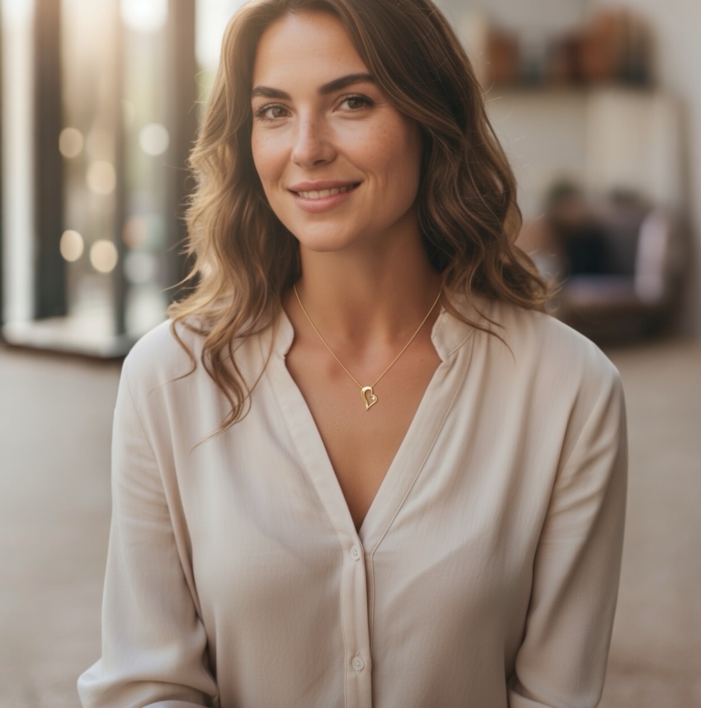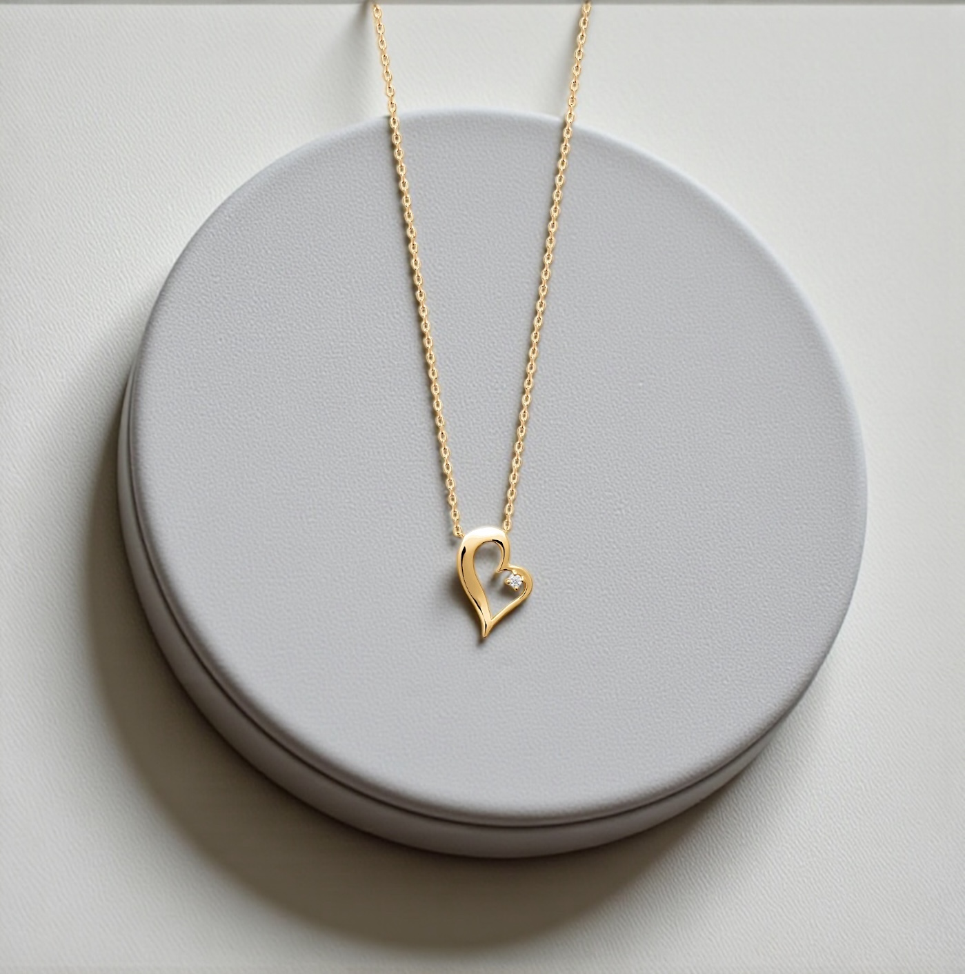 Son pendentif en forme de cœur ajouré, aux courbes fluides et épurées, évoque la tendresse d’un lien sincère. Au creux de ce cœur, un seul oxyde de zirconium scintille avec subtilité, comme une étoile précieuse nichée dans un écrin d’or, apportant une touche d’éclat discrète mais raffinée.