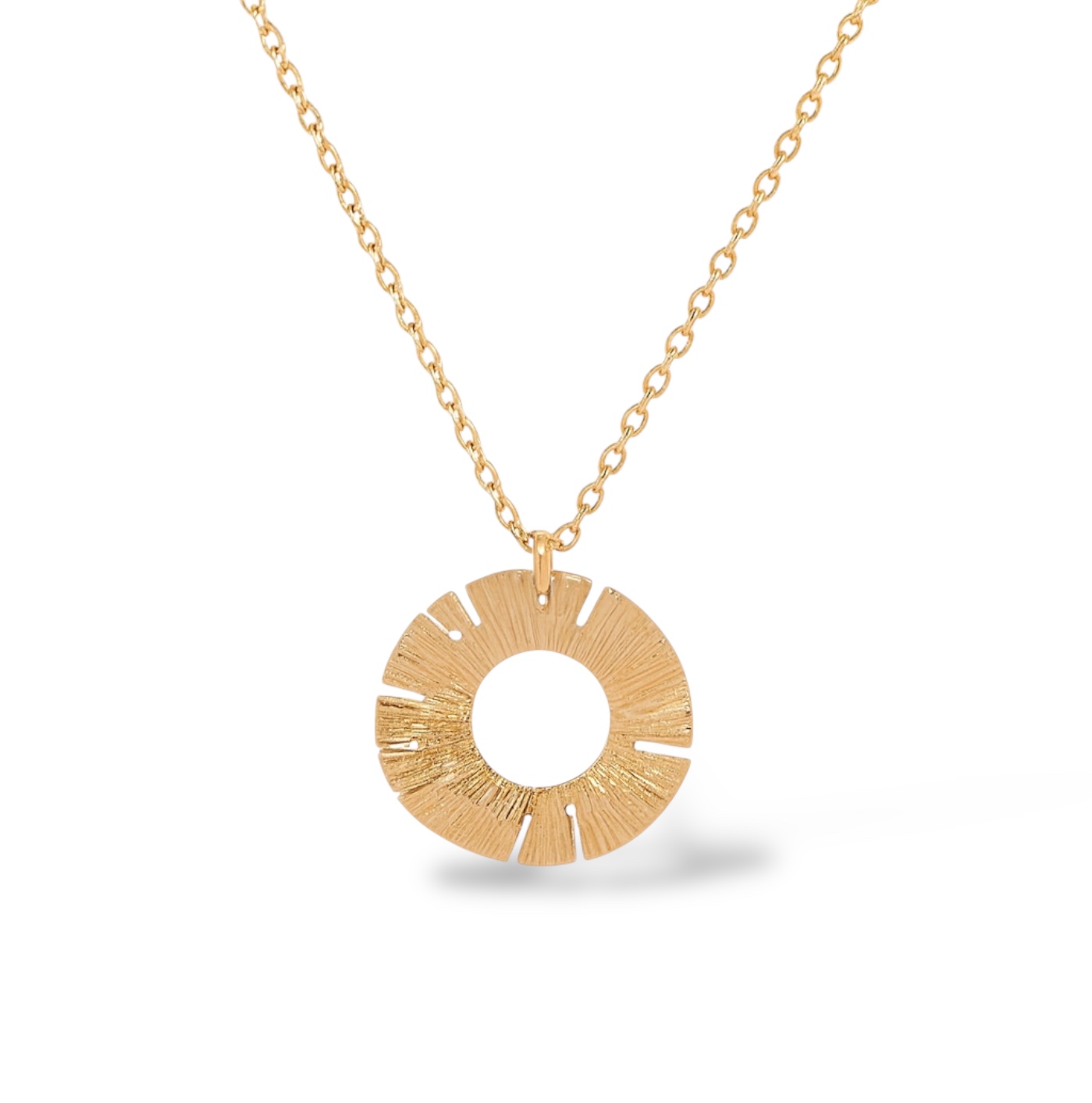 Ce collier en plaqué or 18 carats séduit par son design graphique et lumineux, pensé comme un véritable symbole de rayonnement et d’énergie. Son pendentif circulaire, finement strié et ajouré, évoque un soleil stylisé dont les lignes texturées captent la lumière à chaque mouvement.