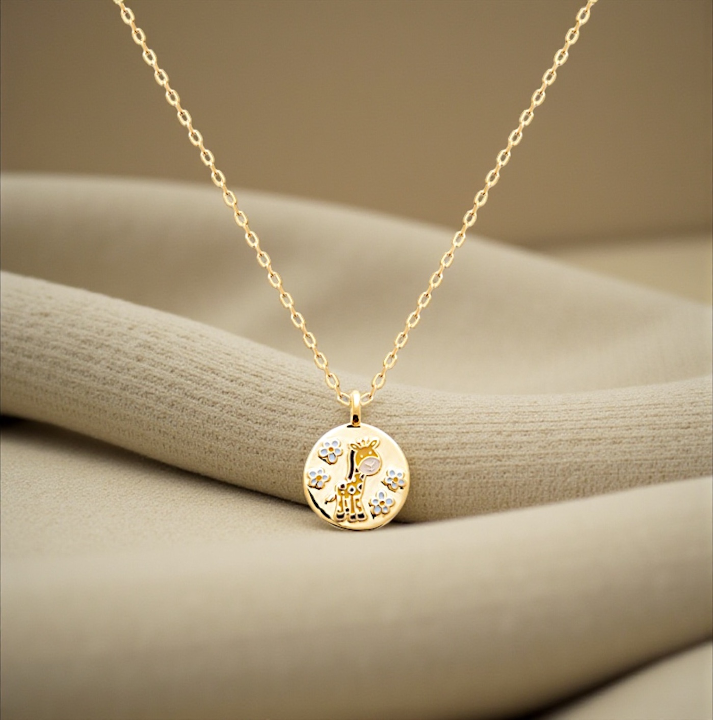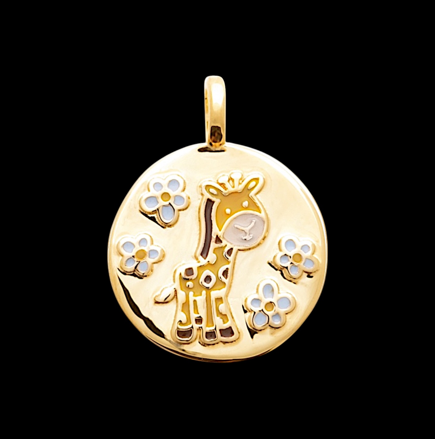 Ce délicat pendentif en plaqué or 18 carats met en scène une adorable petite girafe, dessinée avec douceur et tendresse, pour accompagner les enfants dans un univers joyeux et bienveillant. Sa médaille ronde, soigneusement travaillée, accueille une girafe lumineuse entourée de petites fleurs colorées en laque de couleur, créant un bijou pétillant et plein de vie.