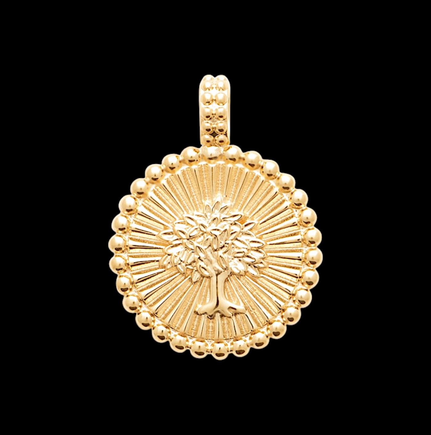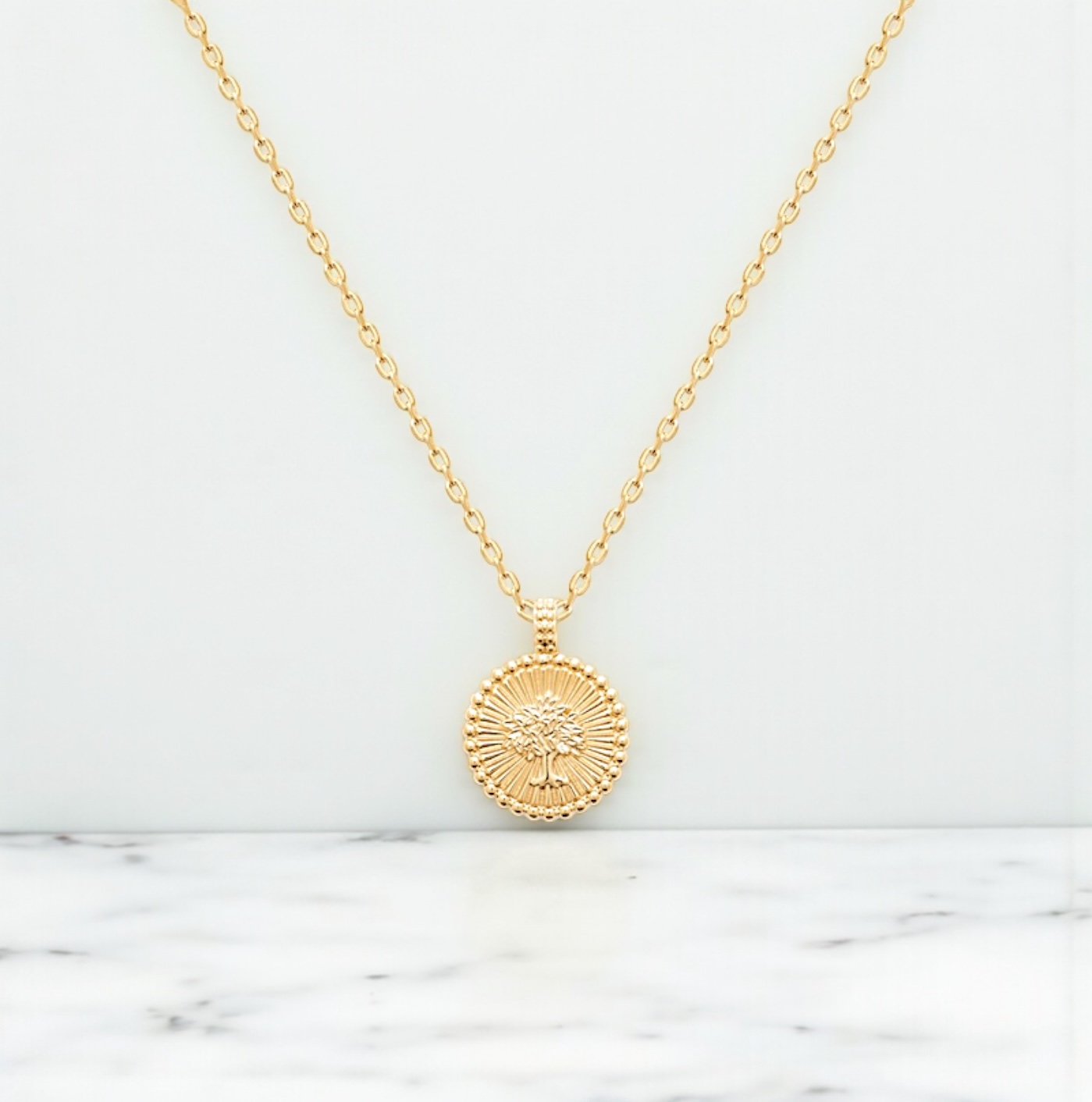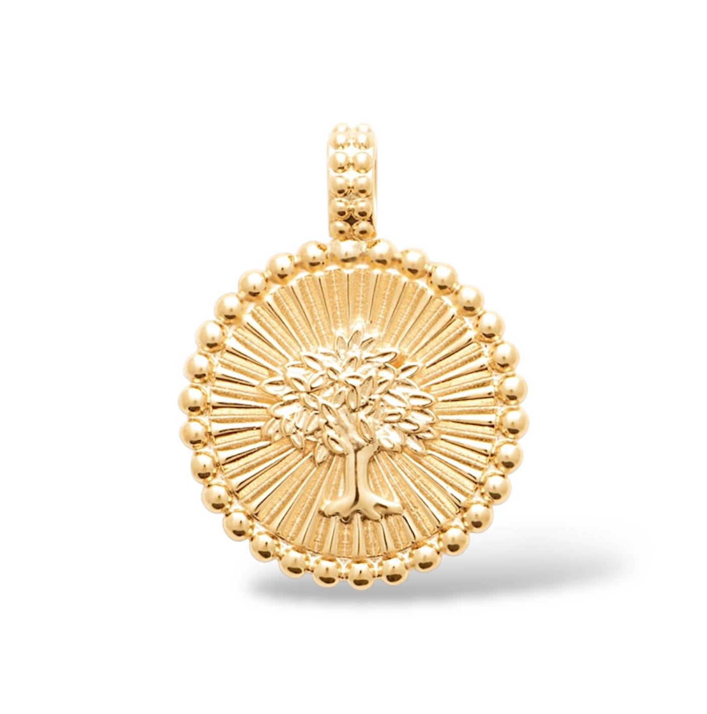 Ce pendentif plaqué or 18 carats incarne la lumière, la vitalité et la connexion à la nature. Au centre de sa médaille ronde se dresse un arbre de vie finement sculpté, symbole intemporel de force, d’équilibre et de renaissance. Chaque détail de ses branches et de ses racines est mis en valeur par un magnifique fond rayonnant, évoquant la chaleur du soleil et l’énergie vitale qu’il diffuse.